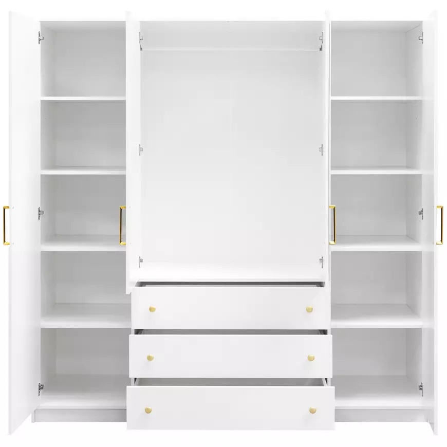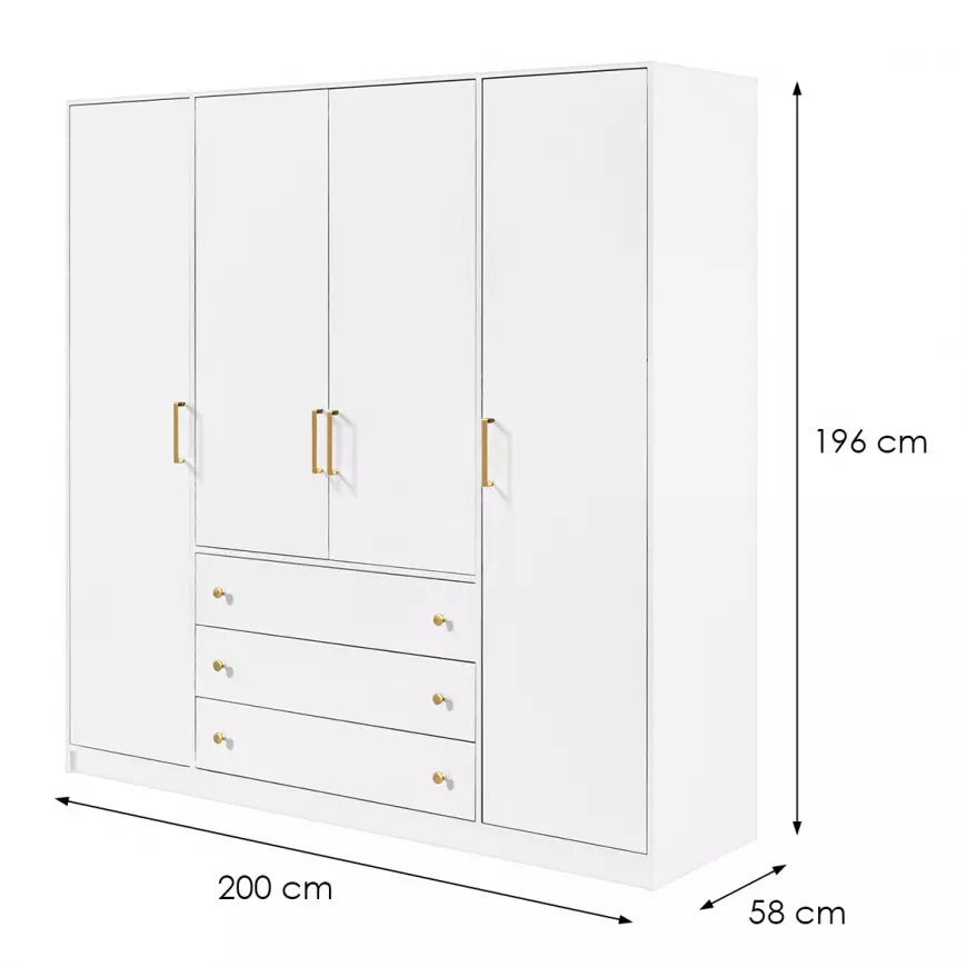 Szafa Bali D4 posiada drzwi uchylne, co umożliwia łatwy dostęp do wszystkich jej zakamarków. Drzwi te są wyposażone w uchwyty w kolorze złotym, które nadają meblowi elegancki charakter i subtelny blask, doskonale komponując się z białym wykończeniem. Szerokość szafy wynosi 196 cm, a jej głębokość to 58 cm, co sprawia, że jest to mebel pojemny, a jednocześnie nie zajmuje zbyt dużo miejsca.