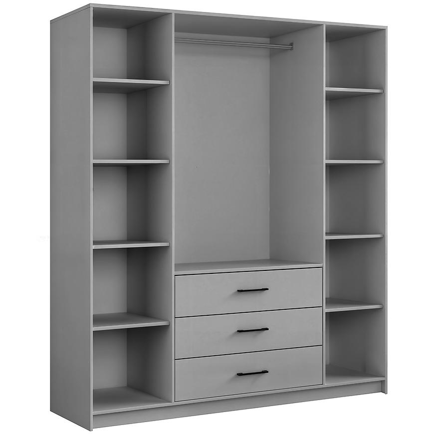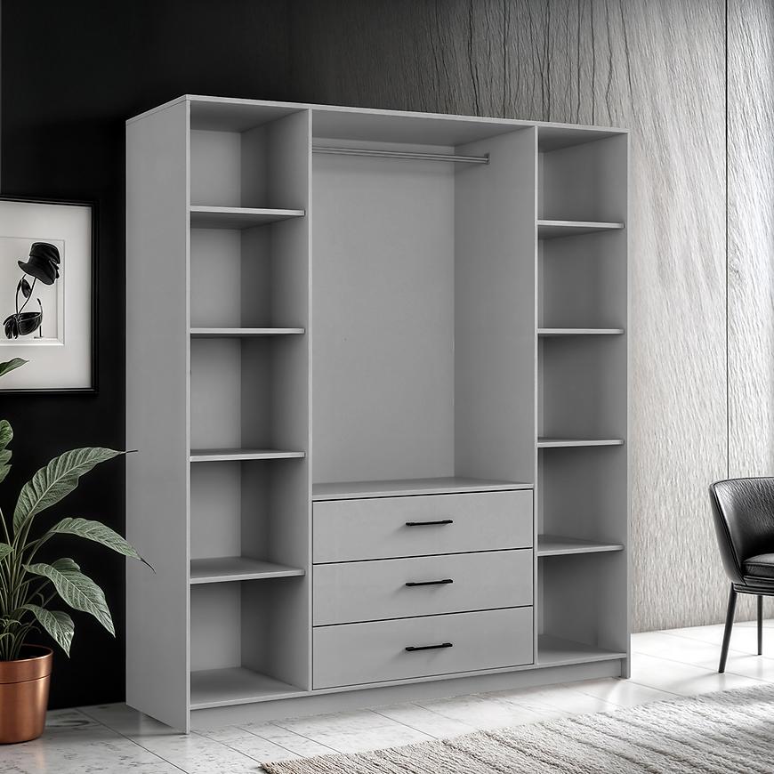 Wnętrze szafy zostało zaprojektowane z myślą o optymalnym przechowywaniu. Znajdziesz tu półki, szuflady oraz drążek na ubrania, które pomogą w uporządkowaniu odzieży i akcesoriów. Solidna konstrukcja z laminowanej płyty wiórowej zapewnia trwałość i odporność na codzienne użytkowanie.