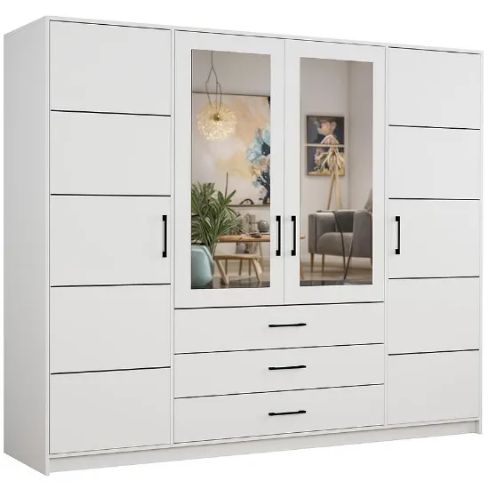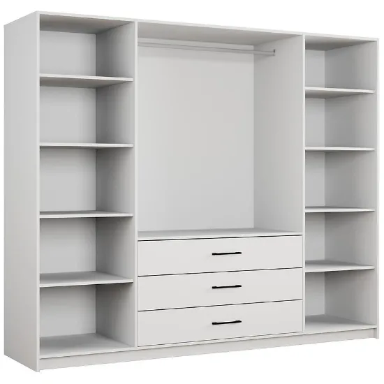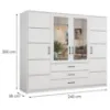 Wnętrze szafy zostało zaprojektowane z myślą o optymalnym przechowywaniu. Znajdziesz tu półki, szuflady oraz drążek na ubrania, które pomogą w uporządkowaniu odzieży i akcesoriów. Solidna konstrukcja z laminowanej płyty wiórowej zapewnia trwałość i odporność na codzienne użytkowanie.