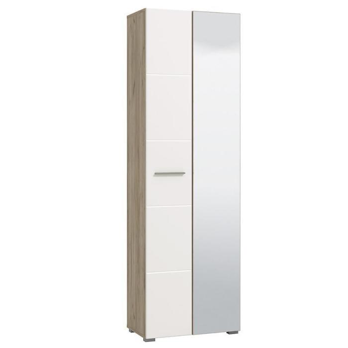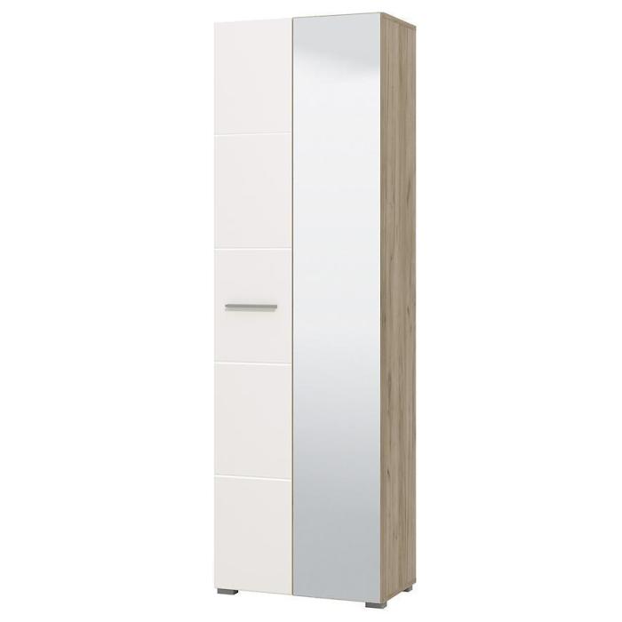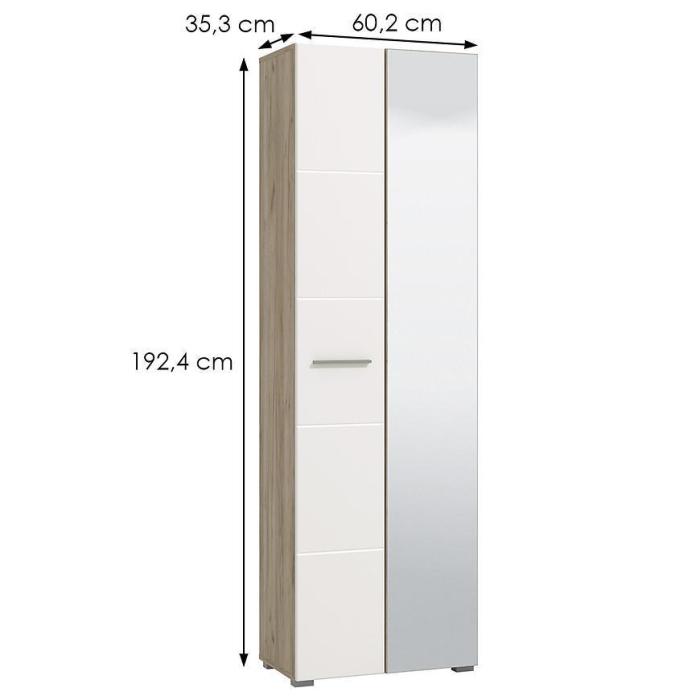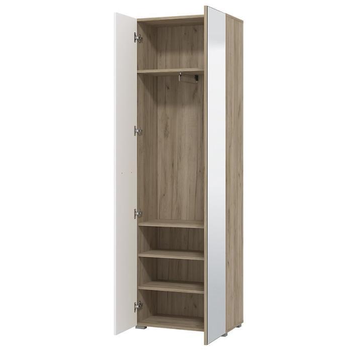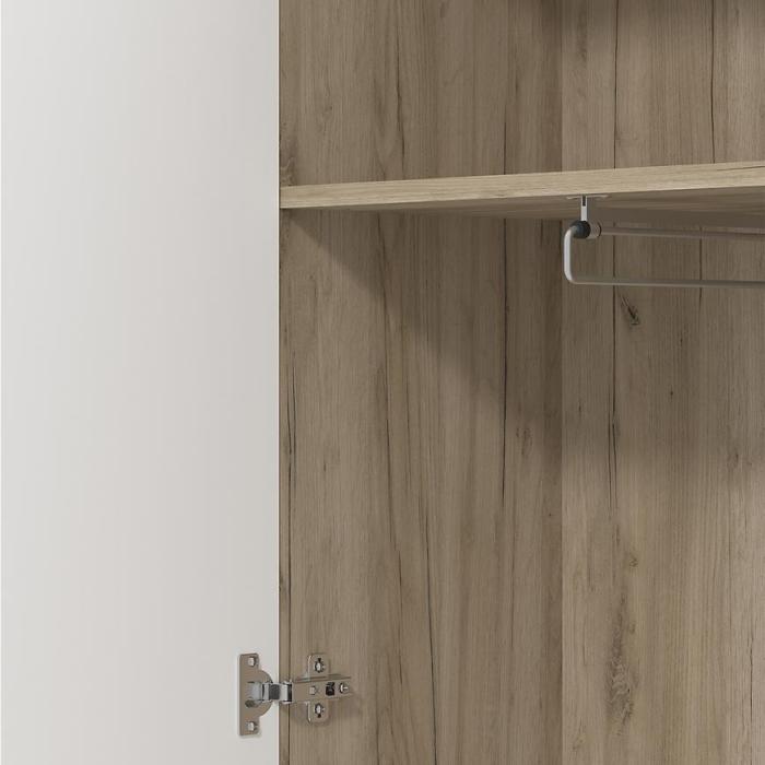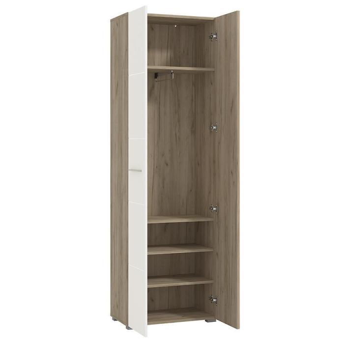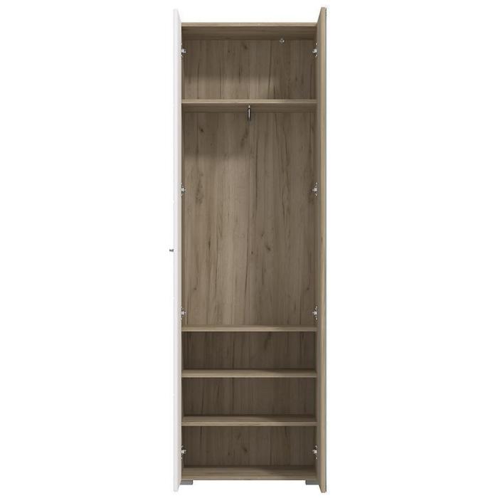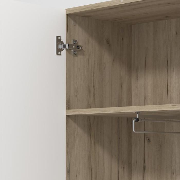We wnętrzu znajduje się miejsce na drążek na długie ubrania i półki do przechowywania ubrań i rzeczy. Pojemna szafa jest wykonana z odpornej płyty laminowanej.