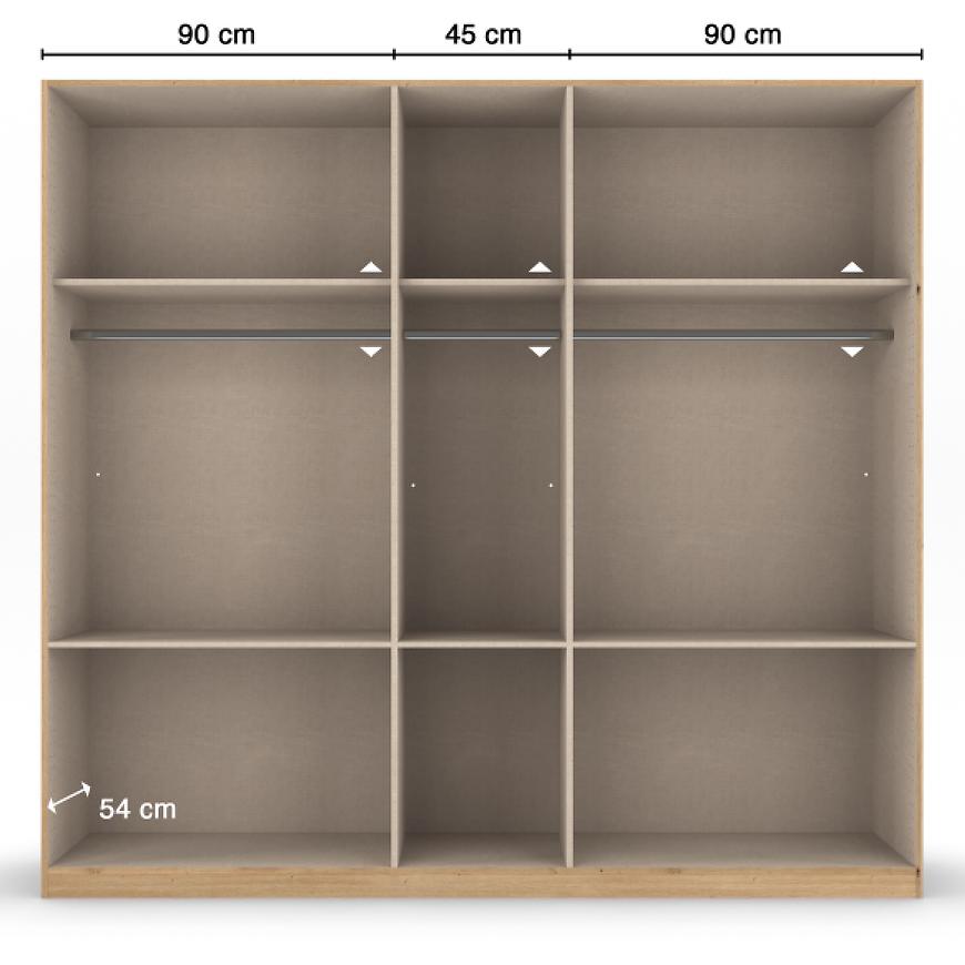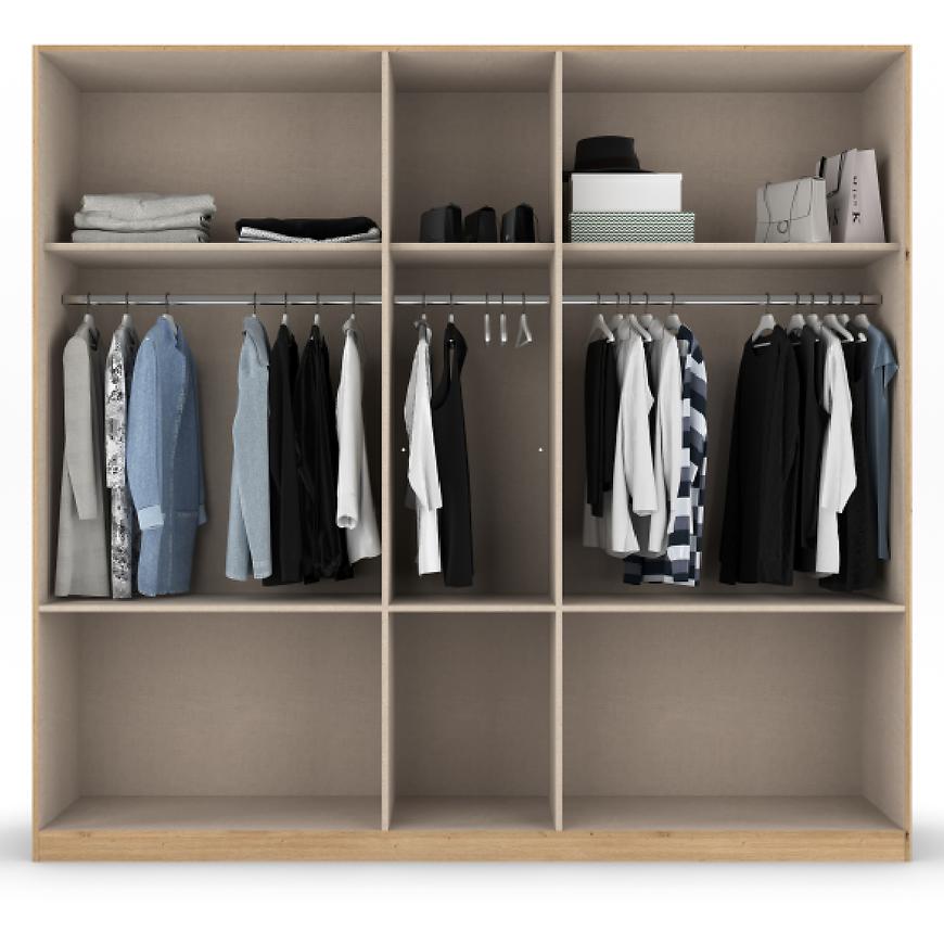 Szafa Bilbao oferuje dużą przestrzeń do przechowywania garderoby. Możesz swobodnie zawiesić swoje ubrania na wieszakach, a także posegregować je na półkach i wewnątrz przegródek. Dzięki temu będziesz mieć wszystko zorganizowane i łatwo dostępne.