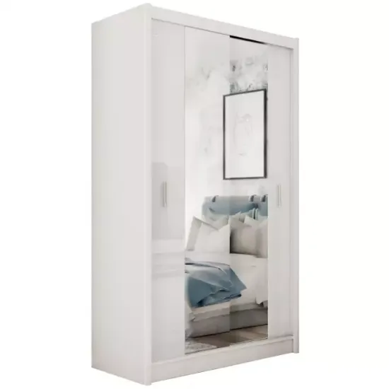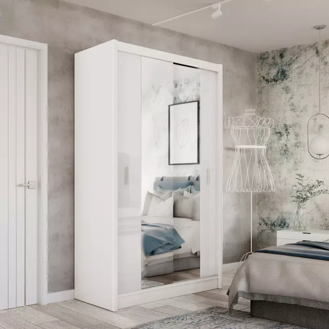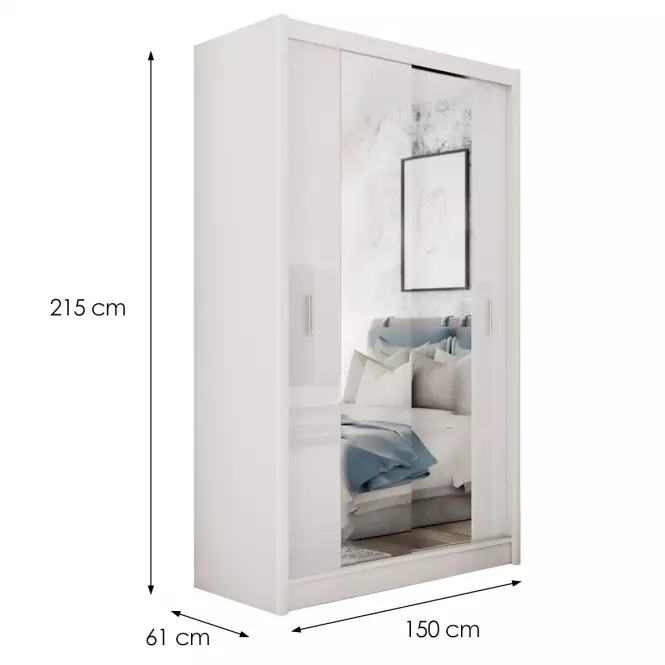 Dwudrzwiowy system przesuwny ułatwia dostęp do wnętrza szafy, a dodatkowe lustro na jednym z frontów pełni funkcję praktyczną i estetyczną. Lustro optycznie powiększa przestrzeń, dodając wnętrzu lekkości i nowoczesnego stylu. Fronty w wykończeniu na wysoki połysk w kolorze białym dodają elegancji i nowoczesnego charakteru, idealnie komponując się z różnymi aranżacjami wnętrz.