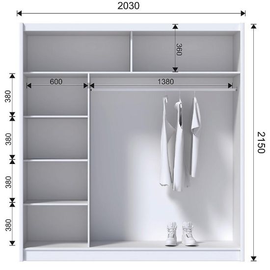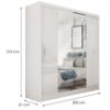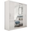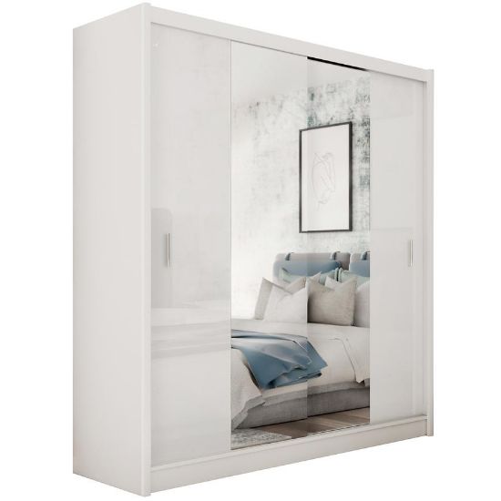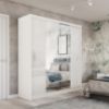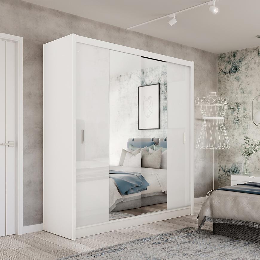 Dwudrzwiowy system przesuwny ułatwia dostęp do wnętrza szafy, a dodatkowe lustro na jednym z frontów pełni funkcję praktyczną i estetyczną. Lustro optycznie powiększa przestrzeń, dodając wnętrzu lekkości i nowoczesnego stylu. Fronty w wykończeniu na wysoki połysk w kolorze białym dodają elegancji i nowoczesnego charakteru, idealnie komponując się z różnymi aranżacjami wnętrz.