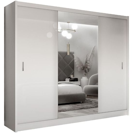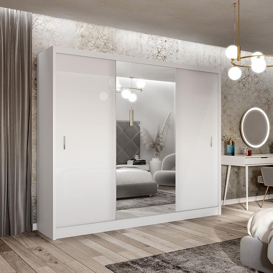 Trzydrzwiowy system przesuwny ułatwia dostęp do wnętrza szafy, a dodatkowe lustro na jednym z frontów pełni funkcję praktyczną i estetyczną. Lustro optycznie powiększa przestrzeń, dodając wnętrzu lekkości i nowoczesnego stylu. Fronty w wykończeniu na wysoki połysk w kolorze białym dodają elegancji i nowoczesnego charakteru, idealnie komponując się z różnymi aranżacjami wnętrz.