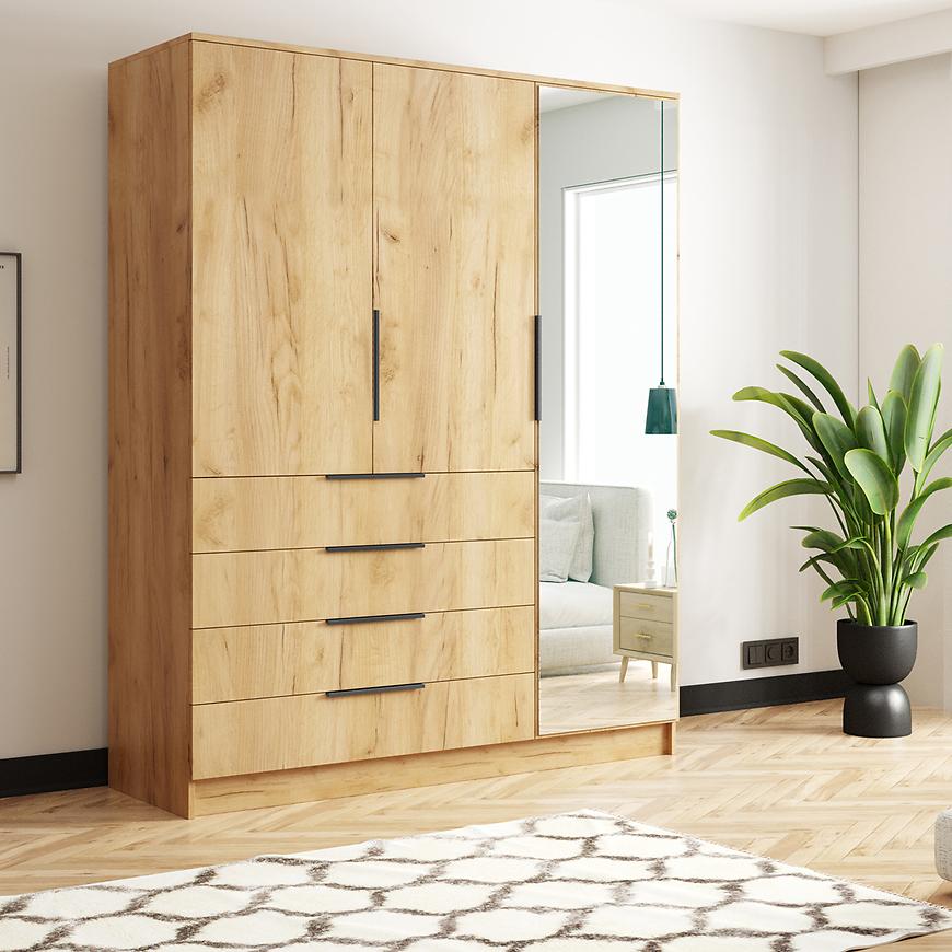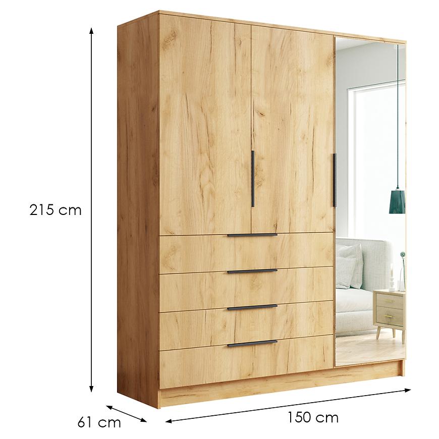 Szafa Bogota 150 to połączenie nowoczesnego designu i wysokiej funkcjonalności, co czyni ją idealnym wyborem do różnorodnych wnętrz. Jej wymiary oferują dużo przestrzeni do przechowywania, a trzydrzwiowy układ zapewnia wygodny dostęp do wnętrza. Szafa wyposażona jest również w lustro, które nie tylko dodaje elegancji, ale także optycznie powiększa przestrzeń, czyniąc ją doskonałym rozwiązaniem do mniejszych pomieszczeń.
