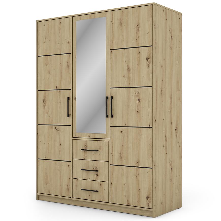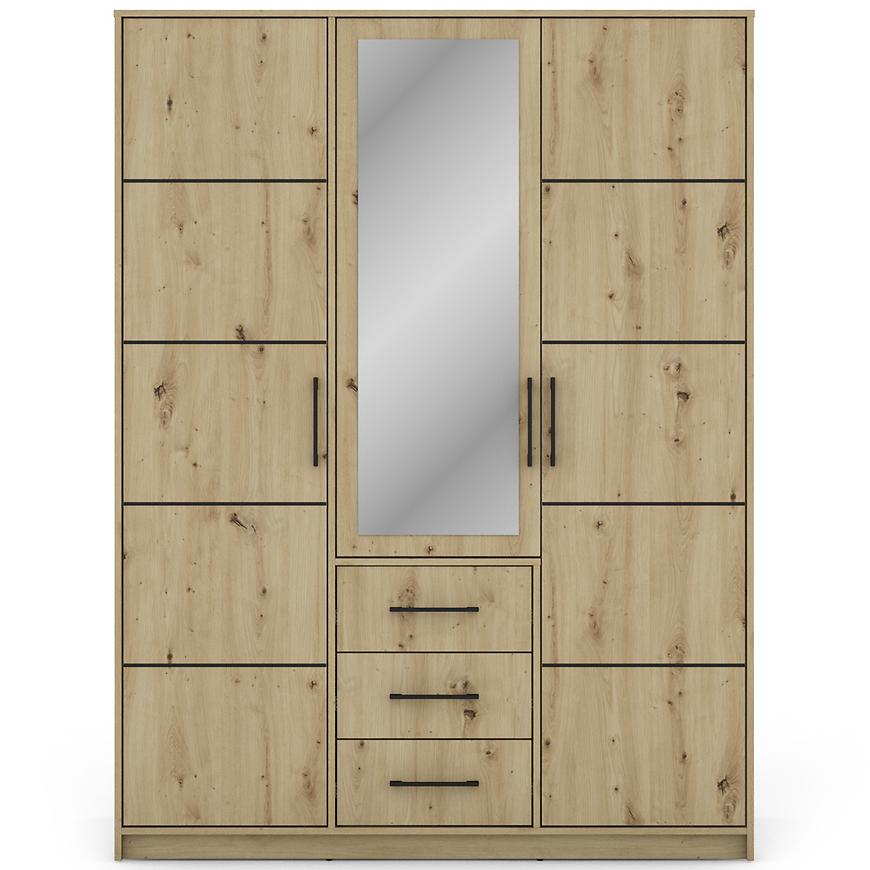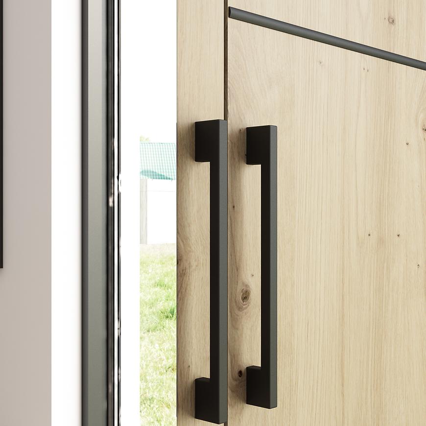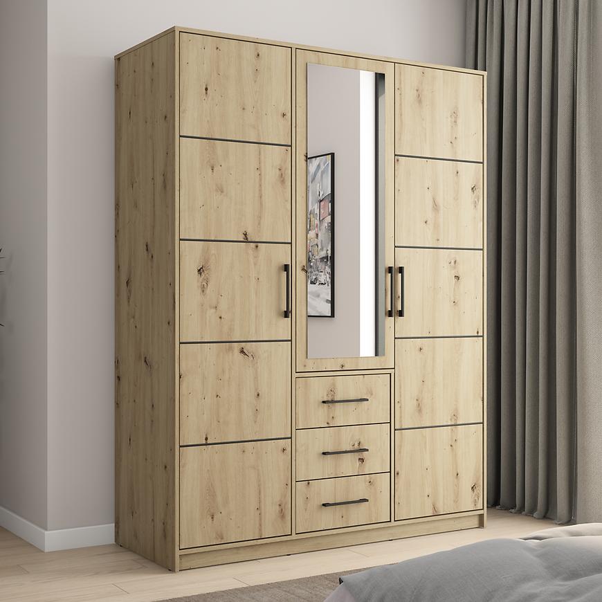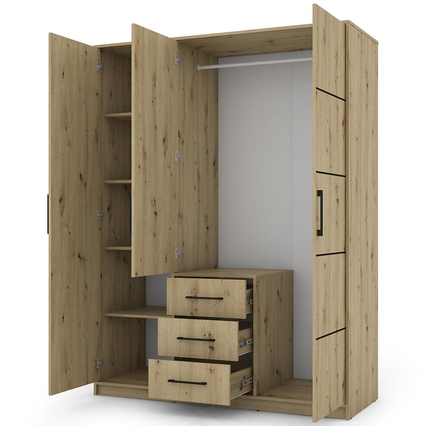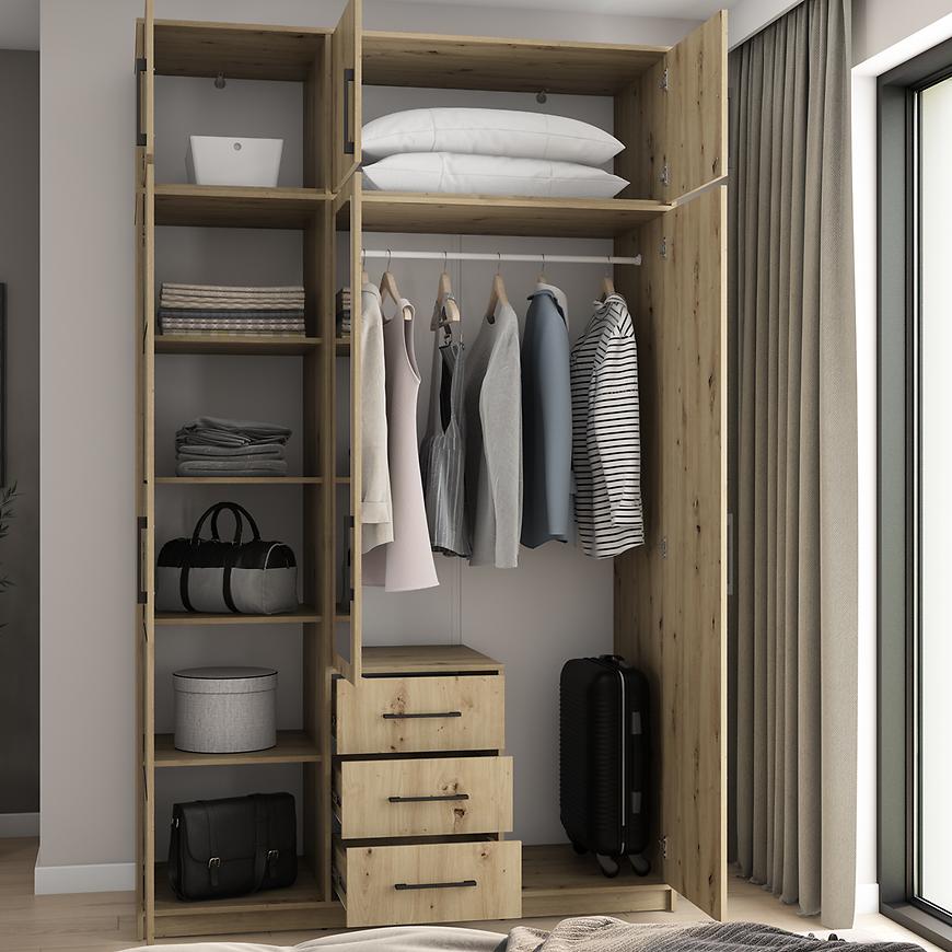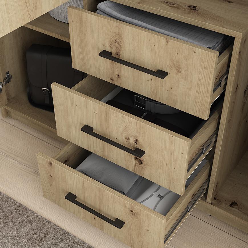 Wnętrze szafy zostało zaprojektowane z myślą o optymalnym przechowywaniu. Znajdziesz tu półki, szuflady oraz drążek na ubrania, które pomogą w uporządkowaniu odzieży i akcesoriów. Solidna konstrukcja z laminowanej płyty wiórowej zapewnia trwałość i odporność na codzienne użytkowanie.