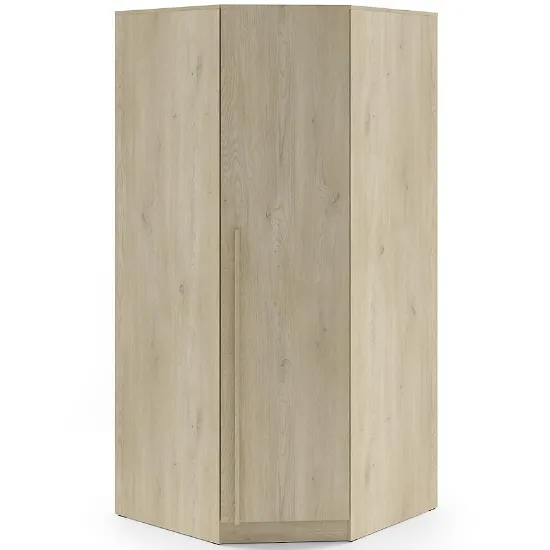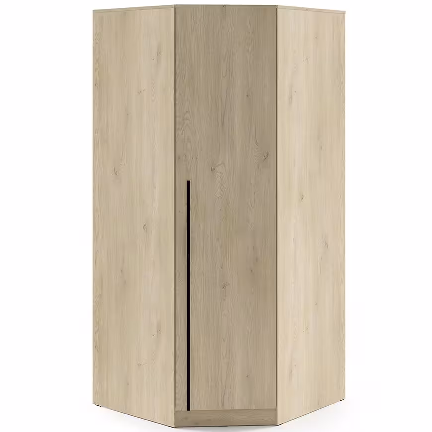 Dzięki narożnemu kształtowi szafa Braga 4 optymalizuje wykorzystanie dostępnej przestrzeni. Jej nowoczesny styl harmonijnie współgra z minimalistycznymi i skandynawskimi wnętrzami, wprowadzając spójny i estetyczny wygląd pokoju. Uchwyty podstawowe są z płyty wiórowej, z której wykonane są meble. Dodatkowo istnieje możliwość zakupu metalowych uchwytów, które pozwalają spersonalizować szafę i nadać jej indywidualny charakter.