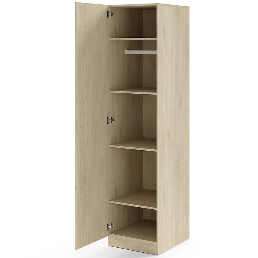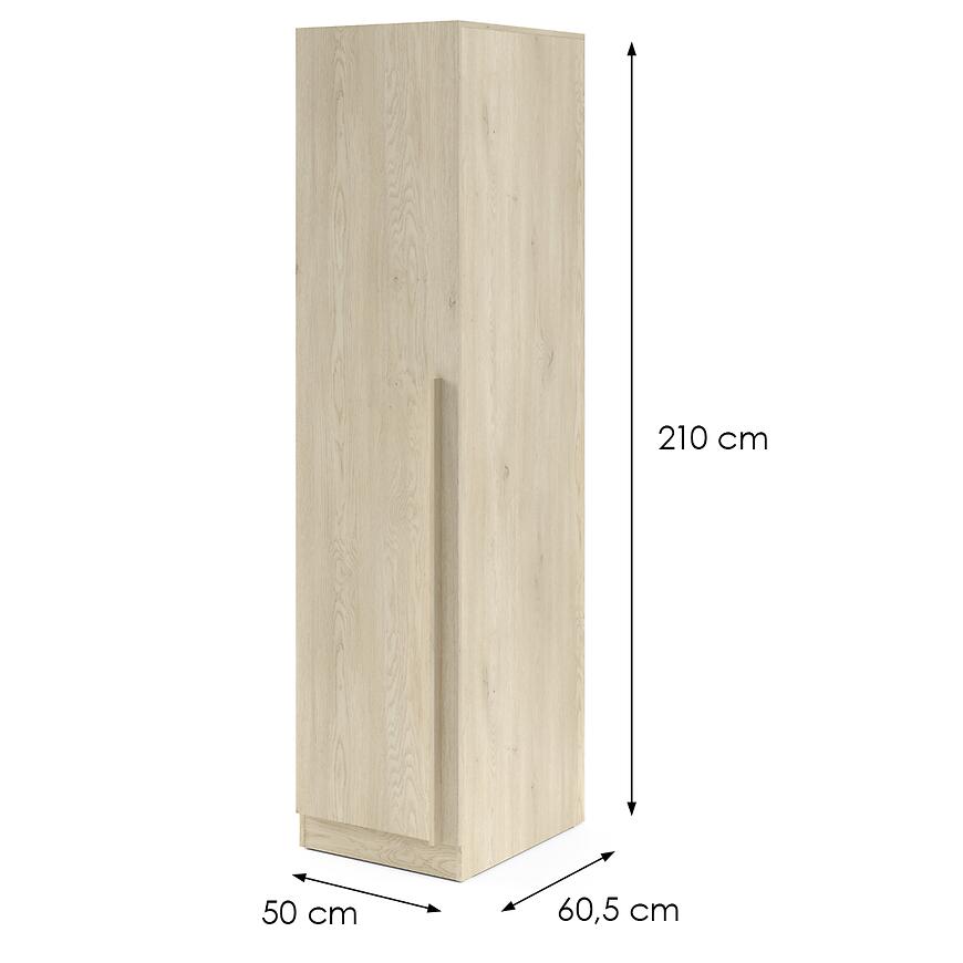 Szafa o wysokości 210 cm i głębokości 60,5 cm zapewnia komfortowe przechowywanie odzieży o różnej długości. Klasyczne drzwi umożliwiają łatwy dostęp do całej zawartości, co sprawdza się szczególnie w codziennym użytkowaniu.