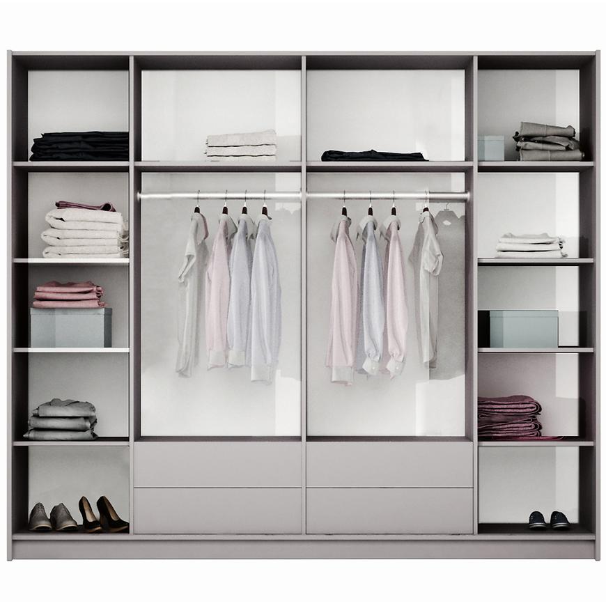 Szafa wyposażona jest w lustro, co jest nie tylko praktycznym dodatkiem ułatwiającym codzienne przygotowania, ale także optycznie powiększa przestrzeń. Wewnątrz, mebel oferuje 4 szuflady, półki oraz drążek na ubrania, co umożliwia łatwe i efektywne organizowanie zawartości – od odzieży pościelowej, przez ubrania, aż po drobne akcesoria.