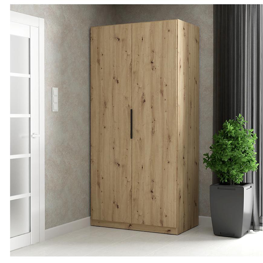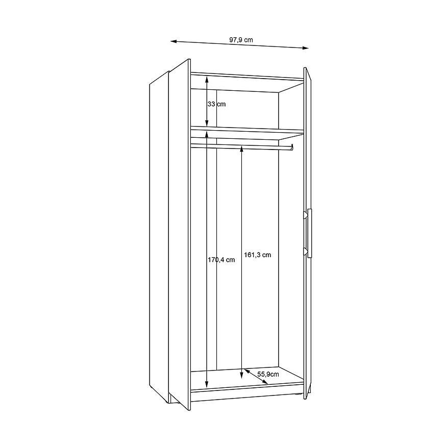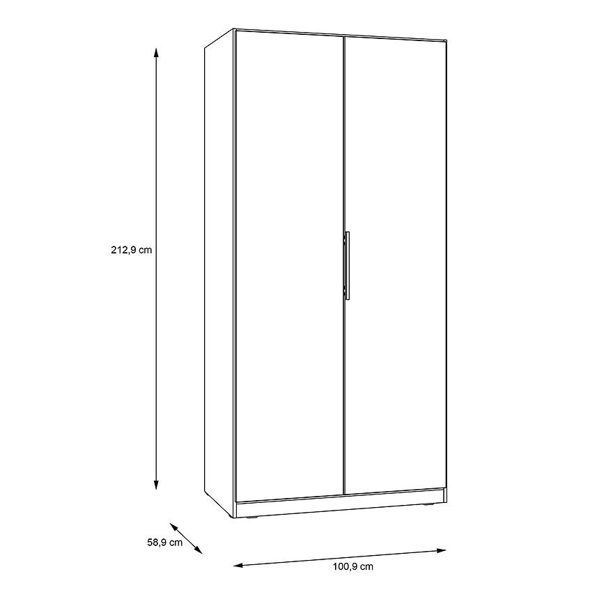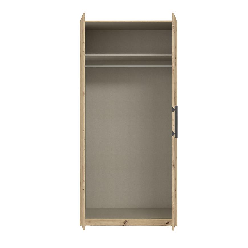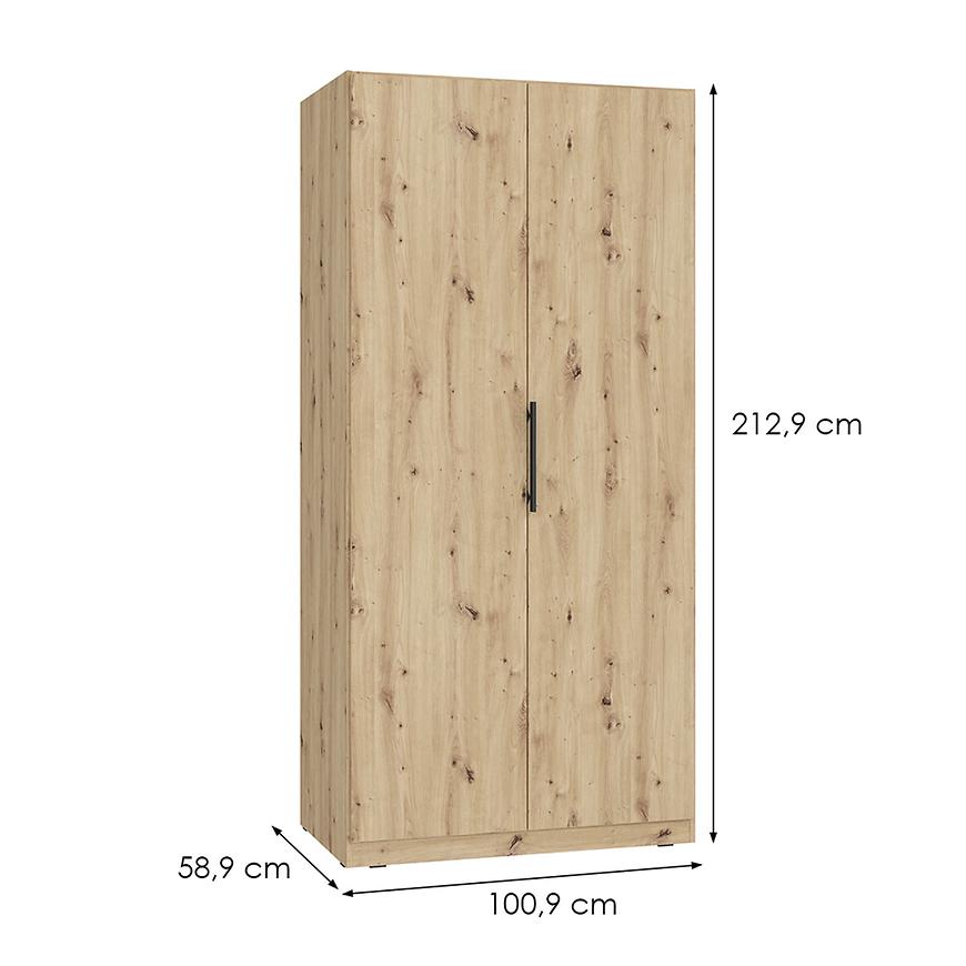 Szafa prezentuje się imponująco, mając szerokość 100,9 cm, wysokość 212,9 cm i głębokość 58,9 cm. Dwudrzwiowy design z klasycznymi drzwiami dodaje meblowi uroku i ponadczasowego charakteru. Dębowe fronty w stylu artisan nadają szafie unikalny, naturalny wygląd, podkreślając klasyczny styl mebla. Matowe wykończenie frontów i korpusu dodaje elegancji, a zarazem chroni przed śladami użytkowania.