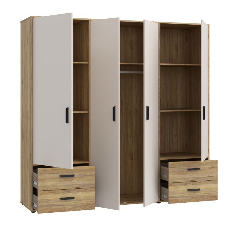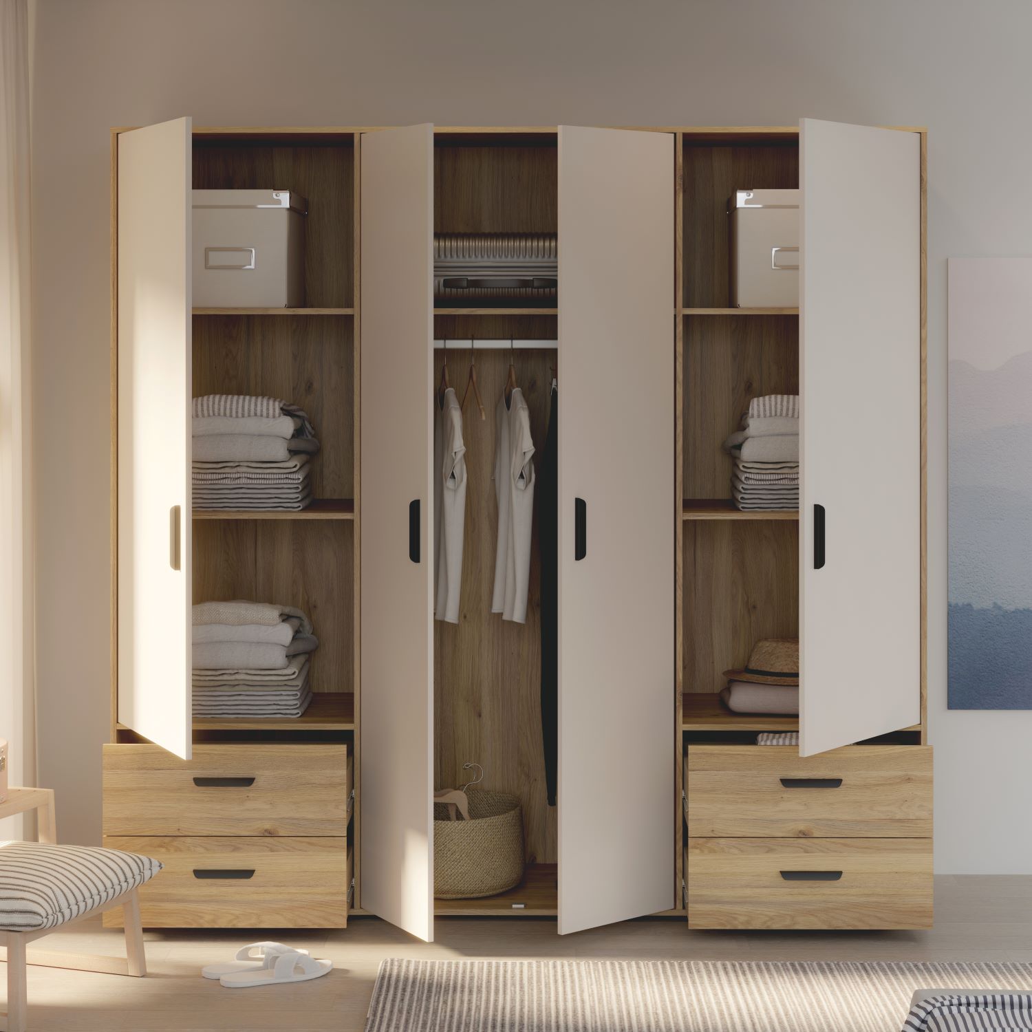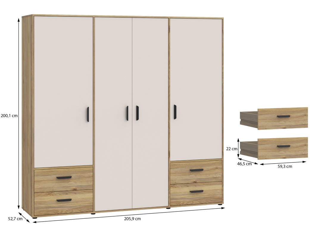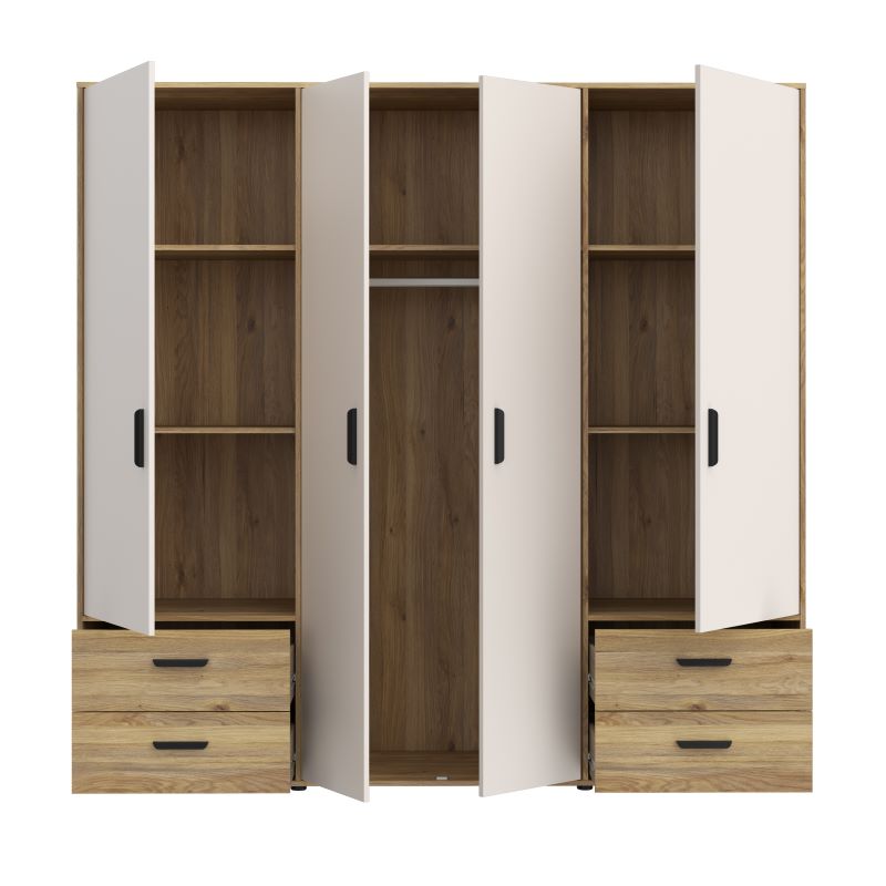 Szafa wyposażona jest w cztery drzwi oraz cztery praktyczne szuflady, co zapewnia dużą przestrzeń do przechowywania ubrań, dodatków i innych akcesoriów. Wnętrze szafy pozwala na wygodną organizację – pojemne półki, drążek na wieszaki oraz szuflady zapewniają łatwy dostęp do wszystkich niezbędnych rzeczy.