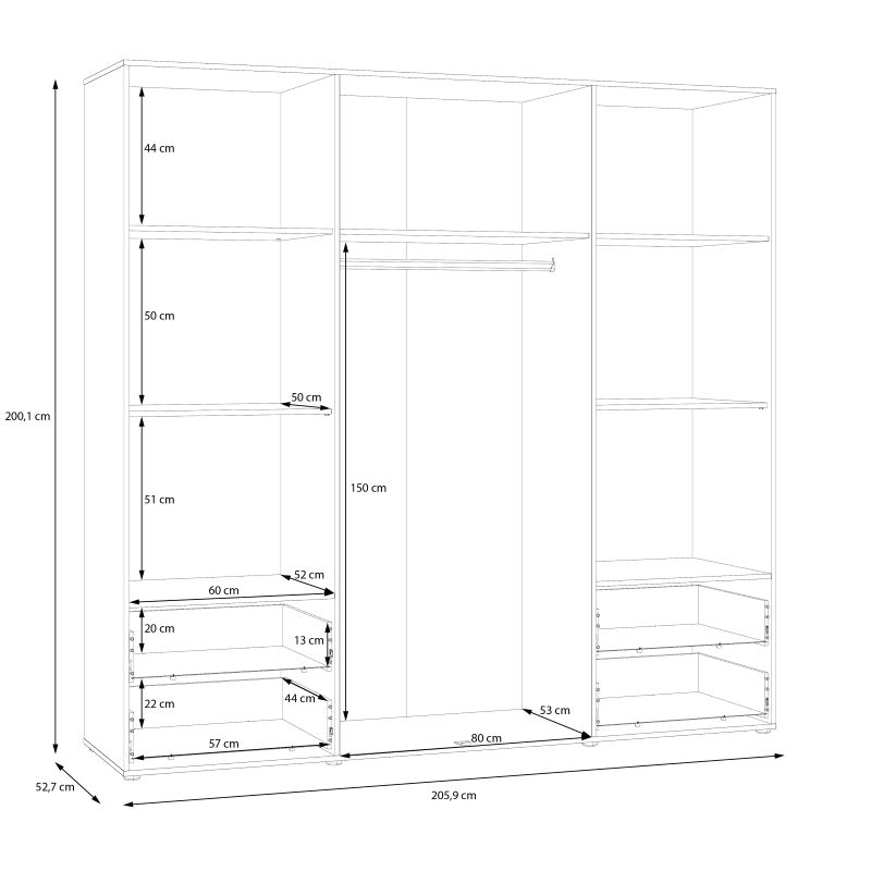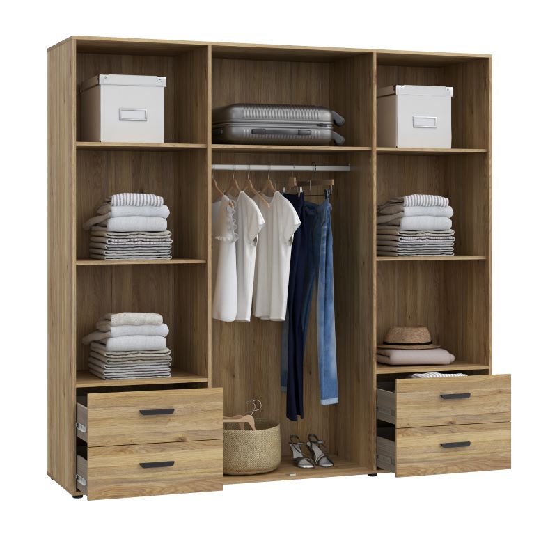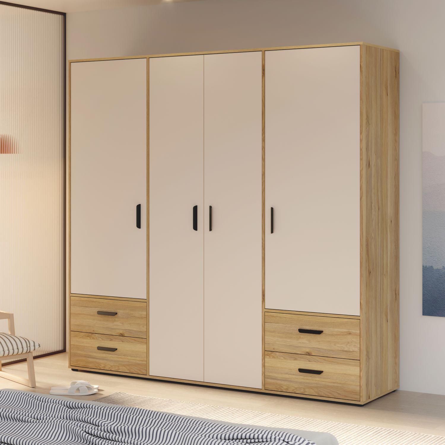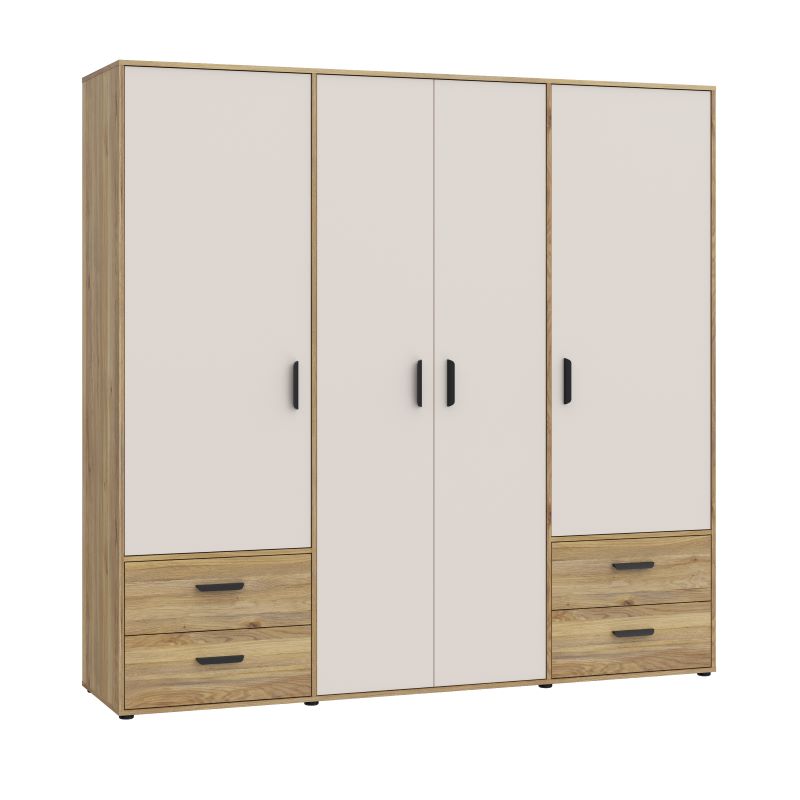Szafa wyposażona jest w cztery drzwi oraz cztery praktyczne szuflady, co zapewnia dużą przestrzeń do przechowywania ubrań, dodatków i innych akcesoriów. Wnętrze szafy pozwala na wygodną organizację – pojemne półki, drążek na wieszaki oraz szuflady zapewniają łatwy dostęp do wszystkich niezbędnych rzeczy.
