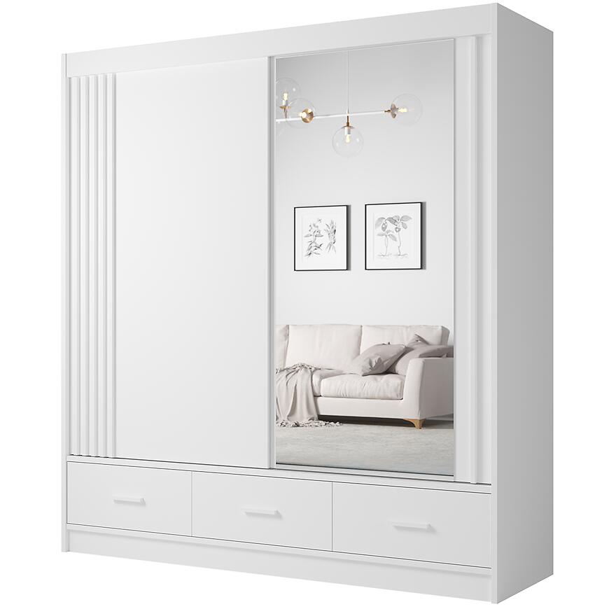 Fronty oraz korpus wykonane z laminowanej płyty wiórowej w białym macie nadają meblowi elegancki i spójny wygląd. Subtelne, białe uchwyty wprowadzają delikatny akcent dekoracyjny, podkreślając nowoczesny styl. Biała szafa z lustrem łatwo dopasuje się do różnych aranżacji – od minimalistycznych po bardziej klasyczne.
