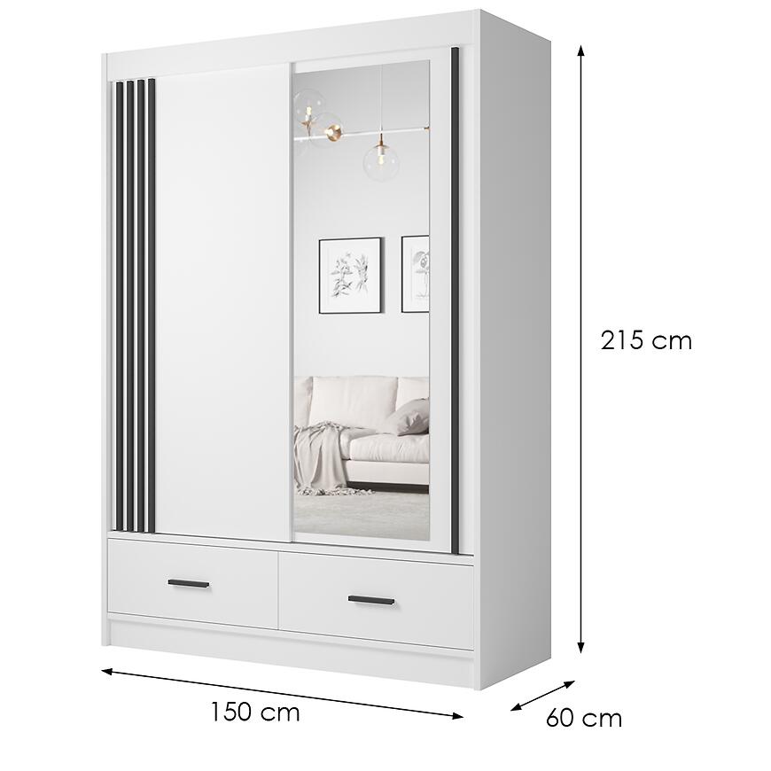 Fronty oraz korpus wykonane z laminowanej płyty wiórowej w białym macie nadają meblowi elegancki i spójny wygląd. Subtelne, czarne uchwyty wprowadzają delikatny akcent dekoracyjny, podkreślając nowoczesny styl. Biała szafa z lustrem łatwo dopasuje się do różnych aranżacji – od minimalistycznych po bardziej klasyczne.