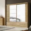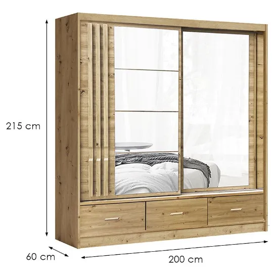 Szafa o szerokości 200 cm oferuje przestronną przestrzeń do przechowywania, idealną do uporządkowania odzieży, pościeli i innych niezbędnych przedmiotów. Solidna konstrukcja oraz przemyślane wnętrze z półkami i drążkami umożliwiają wygodne przechowywanie. To doskonały wybór do sypialni, przedpokoju lub garderoby, który zapewnia zarówno funkcjonalność, jak i elegancki wygląd.