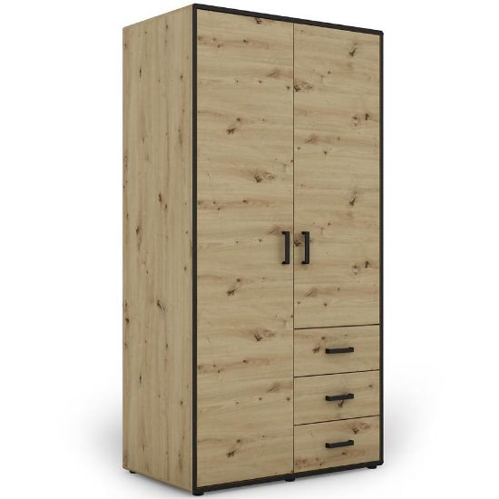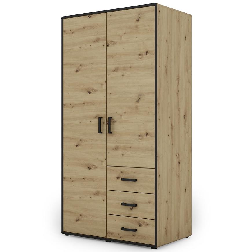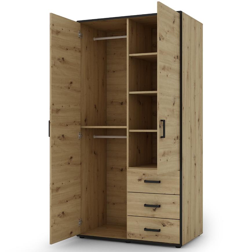Kolor dąb artisan z elementami w kolorze czarnym tworzy interesujący kontrast, który dodaje szafie wyjątkowego charakteru. Wykończenie matowe nadaje meblowi elegancji i subtelnego wyrazu, co sprawia, że doskonale komponuje się z nowoczesnym stylem wnętrz.