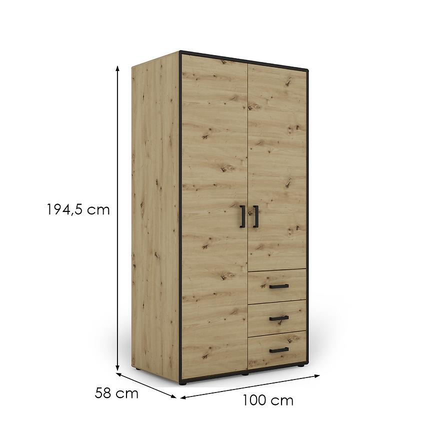 Szafa o wymiarach 194,5 cm wysokości, 100 cm szerokości i 58 cm głębokości to wyjątkowy model, który nie tylko zachwyci Cię swoim wyglądem, ale także zapewni mnóstwo miejsca do przechowywania. Klasyczne dwudrzwiowe drzwi otwierają się, ukazując przemyślanie zaprojektowaną przestrzeń.