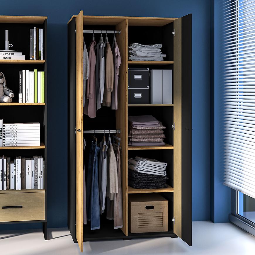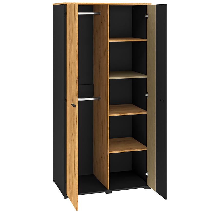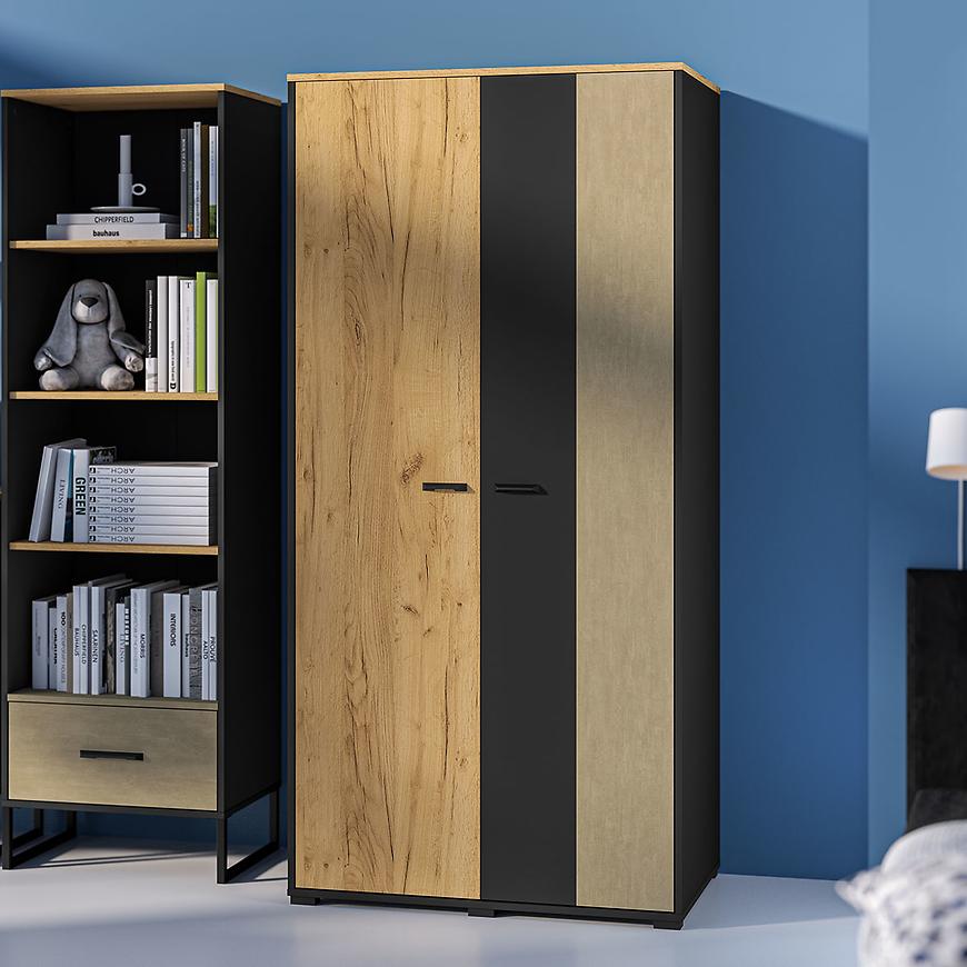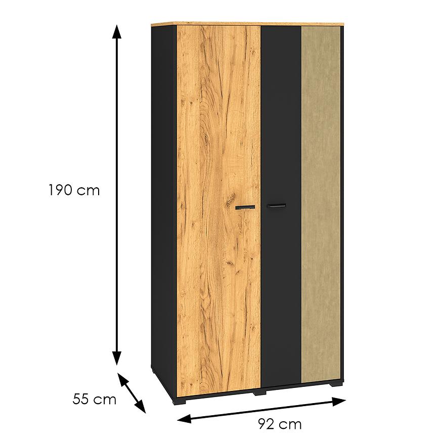 Dzięki jasnemu, drewnopodobnemu wybarwieniu, szafa wprowadza do wnętrza ciepło i naturalny akcent, idealnie kontrastując z ciemnymi elementami, tworząc przy tym stylowy i klasyczny wygląd.