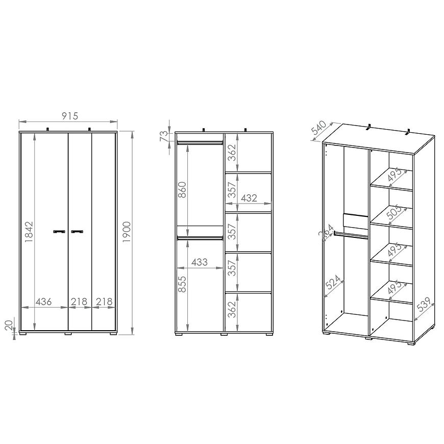 Szafa ma prosty kształt, co sprawia, że jest uniwersalnym wyborem do różnych stylów aranżacji wnętrz. Posiada trzy klasyczne drzwi, które otwierają się na przestronną przestrzeń do przechowywania ubrań i innych przedmiotów.