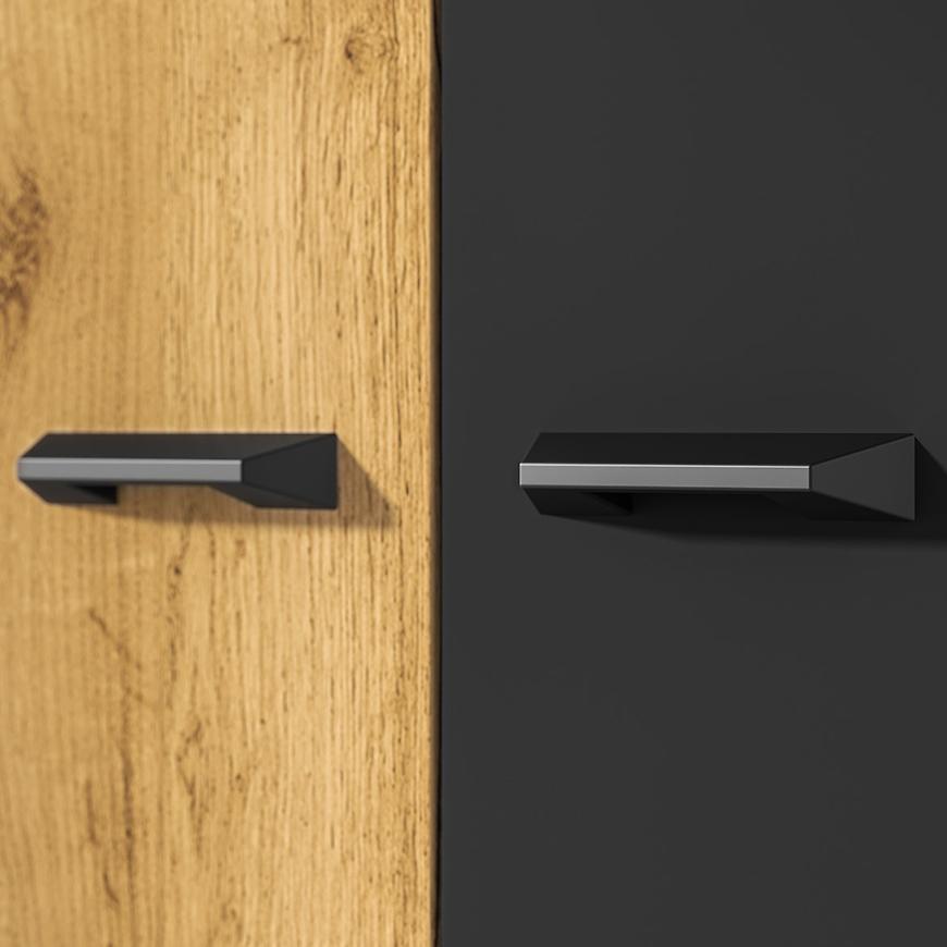 Fronty szafy wykończone są w matowych kolorach dąb craft złoty, czarny, oraz stal premium, co nadaje meblowi elegancki i wyrafinowany wygląd. Korpus szafy również wykończony jest w matowym kolorze czarnym, co harmonijnie komponuje się z frontami. Cała konstrukcja frontów wykonana jest z trwałej płyty wiórowej laminowanej, co zapewnia wytrzymałość i długowieczność mebla.