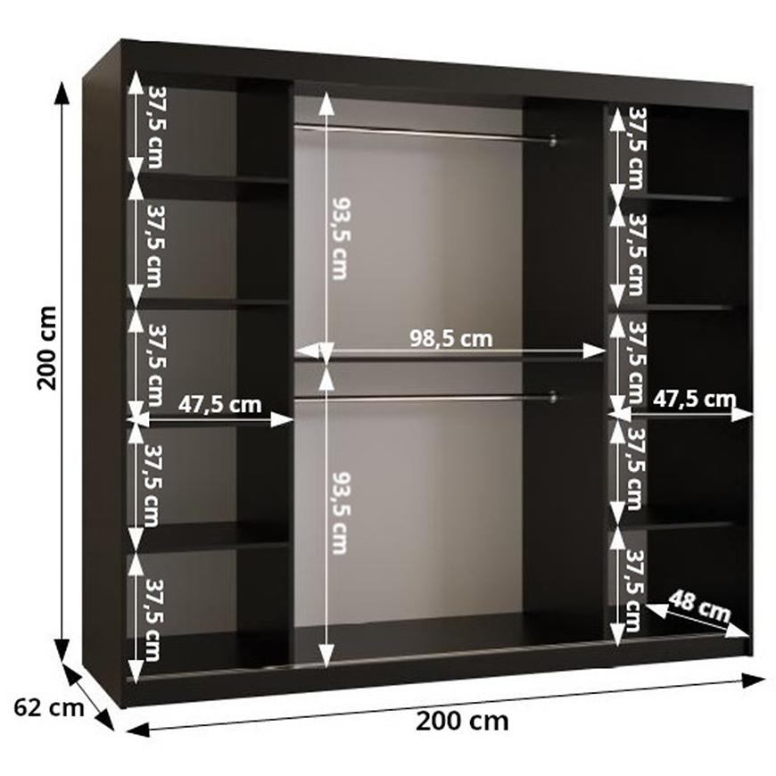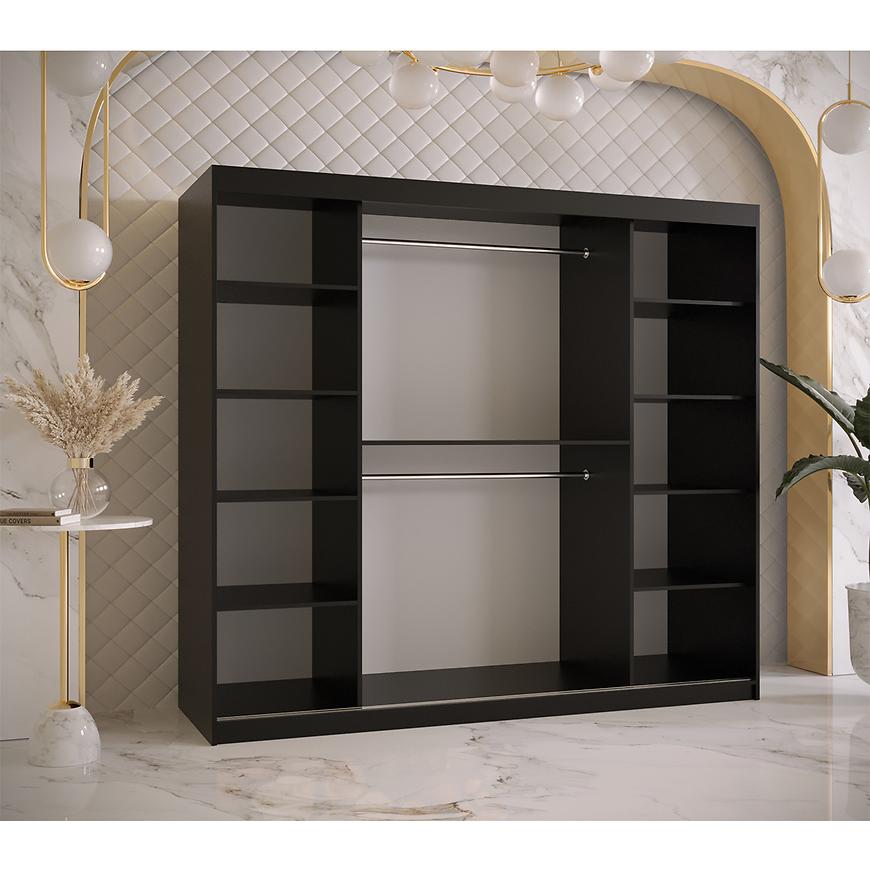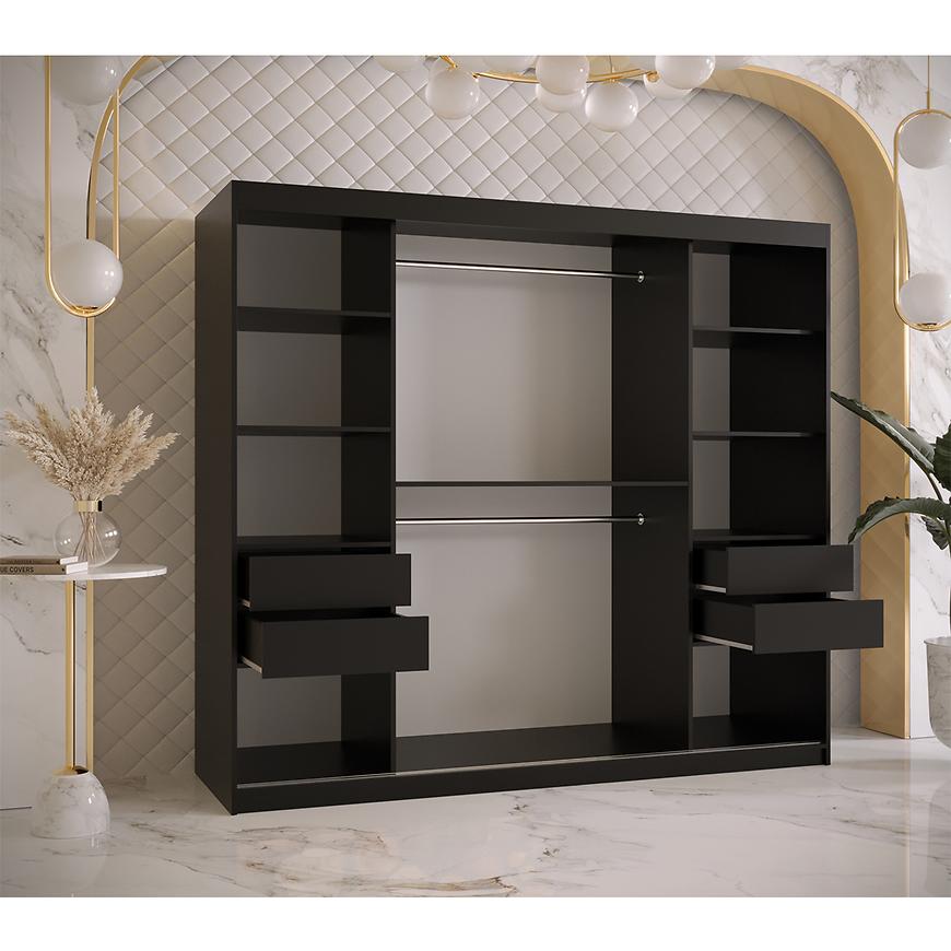Prowadnice aluminiowe gwarantują płynne i ciche przesuwanie drzwi, co sprawia, że korzystanie z szafy staje się nie tylko praktyczne, ale również komfortowe. Uchwyty z tworzywa sztucznego w eleganckim kolorze czarnym to funkcjonalny element, który jednocześnie dodaje szafie nowoczesnego charakteru.