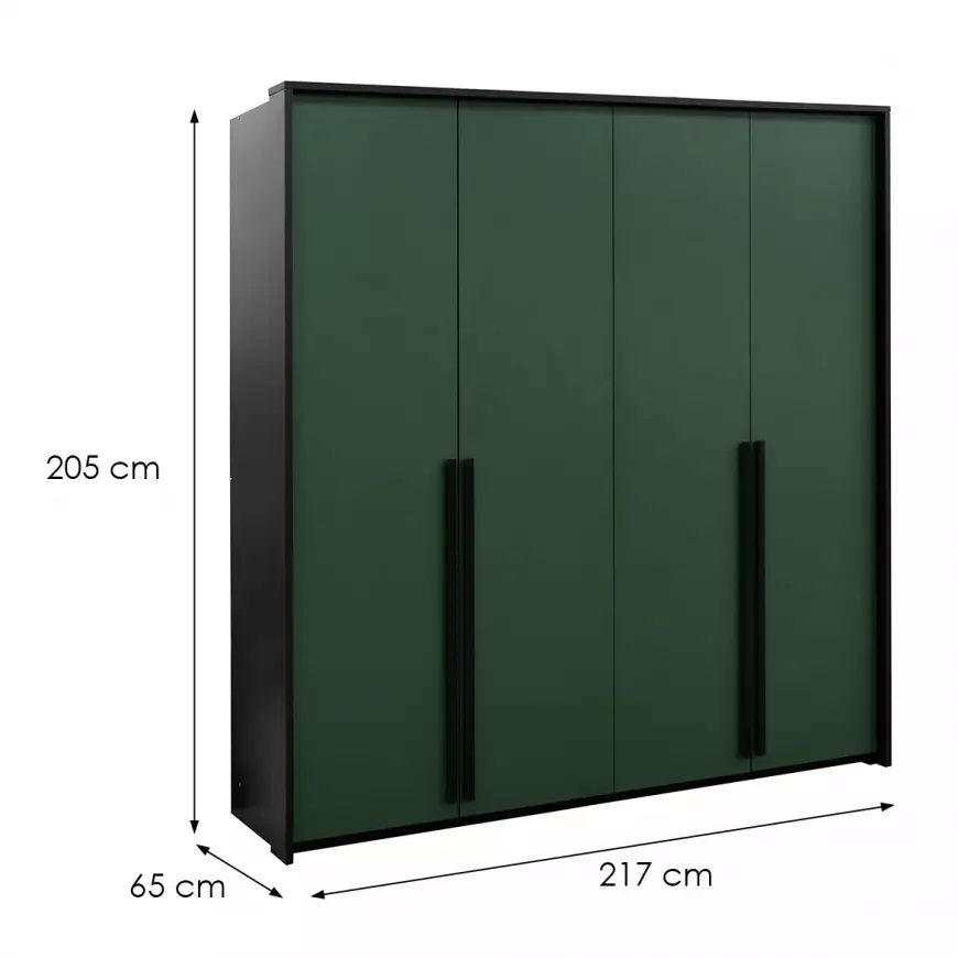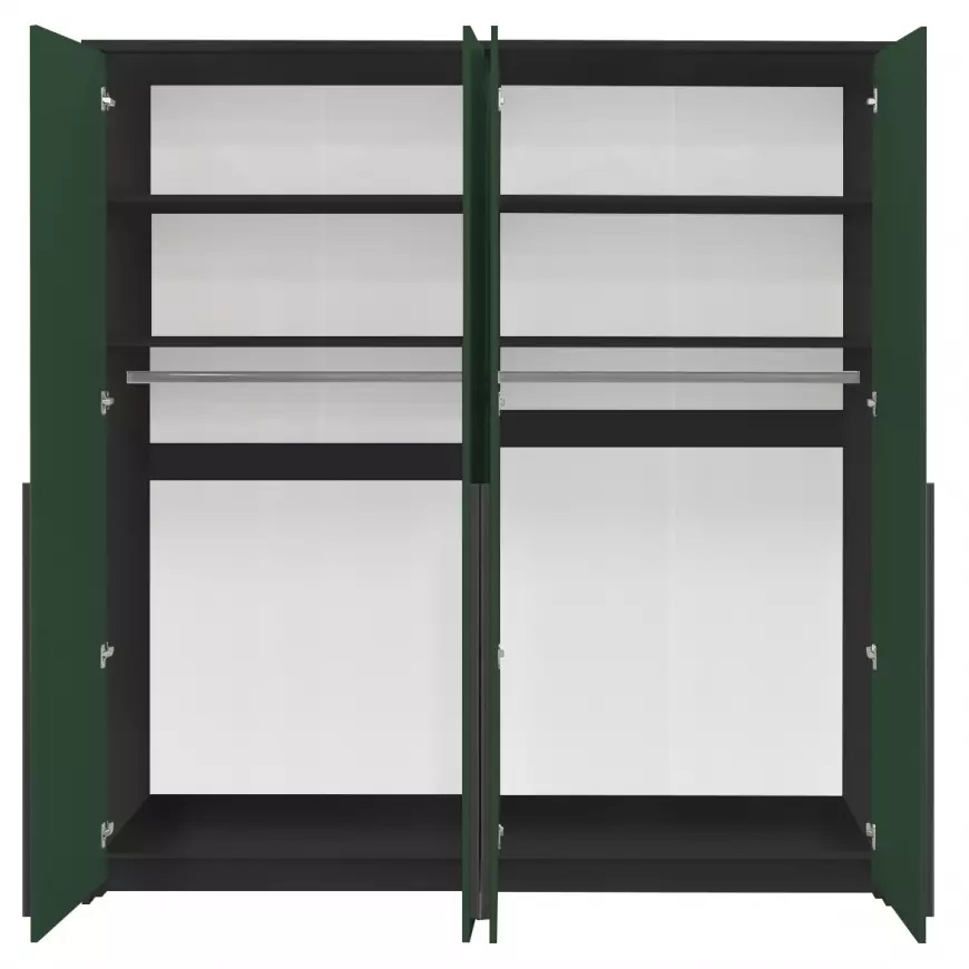 Szafa czterodrzwiowa Genua 210 to doskonałe połączenie nowoczesnego designu i funkcjonalności, które sprawdzi się w każdym wnętrzu. Wykonana z wytrzymałej płyty wiórowej laminowanej, gwarantuje długotrwałe użytkowanie i odporność na uszkodzenia. Fronty szafy dostępne są w eleganckim kolorze butelkowej zieleni, który wprowadza do pomieszczenia odrobinę świeżości i wyrafinowania. Korpus w kolorze czarnym, wraz z matowym wykończeniem zarówno korpusu, jak i frontów, nadaje meblowi nowoczesnego i stylowego wyglądu.