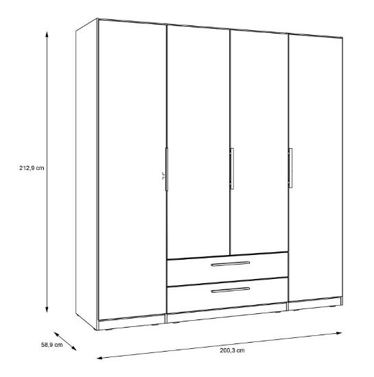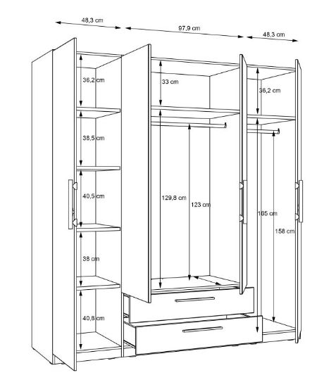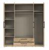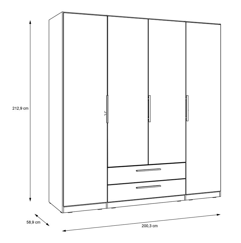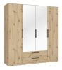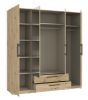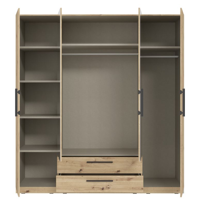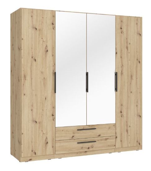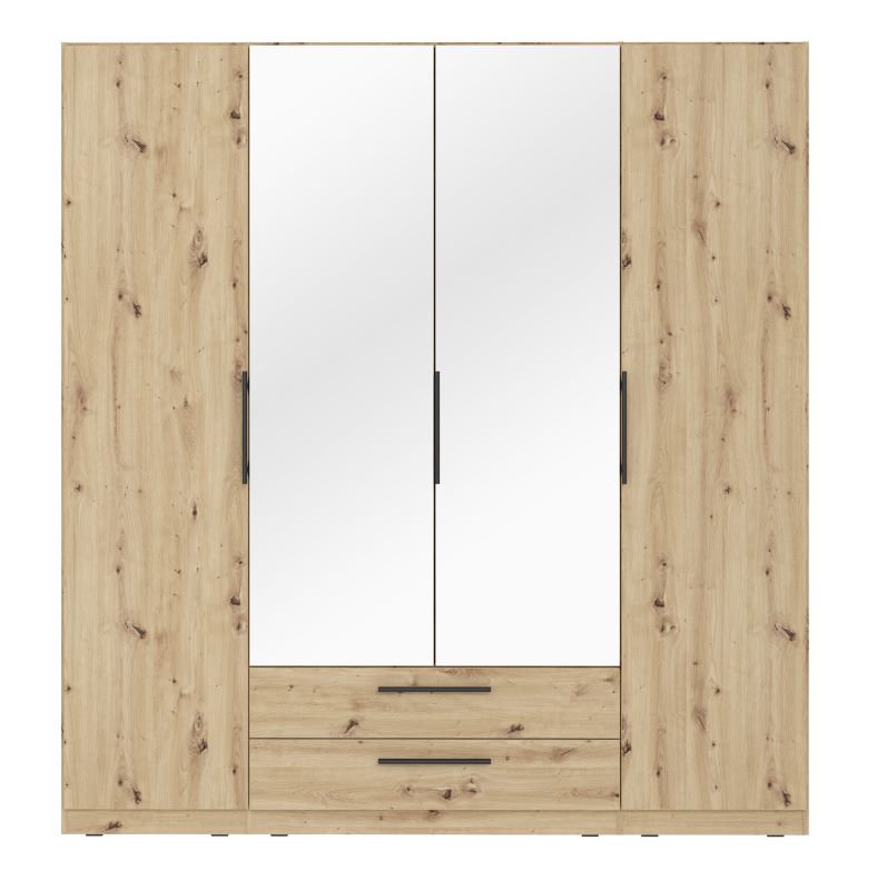 Czterodrzwiowa szafa ubraniowa z lustrem Kadi 2 CDXS84, w standardowym wyposażeniu posiada półki, drążek na ubrania oraz dwie szuflady. Maksymalne dopuszczalne obciążenie dla drążka to 15 kg, dla półek do 10 kg dla szuflad 3 kg. Korpusy i fronty dostępne w wybarwieniu dąb artisan, wykonane z wysokiej jakości płyty wiórowej. Na środkowych drzwiach umieszczone zostały dwa praktyczne lustra. W szafie zastosowano obrzeża ABS które są odporne na uszkodzenia. Uchwyty wykonane z tworzywa w kolorze czarnym. W meblu zastosowano nóżki typu ślizgacz. Szafa w zestawie posiada komplet okuć do montażu ściennego. Neutralna kolorystyka sprawia że można ją wykorzystać w różnorodnych aranżacjach jako samodzielny mebel lub połączyć z innymi szafami z kolekcji Kadi.