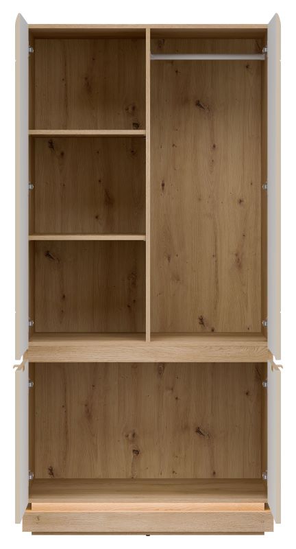 Wnętrza mebli zostały zaprojektowane z myślą o wygodzie codziennego użytkowania. Szuflady wyposażono w prowadnice kulkowe z pełnym wysuwem, co ułatwia dostęp do przechowywanych przedmiotów, a drzwi z systemem cichego domykania zwiększają komfort i eliminują nieprzyjemne trzaski. Korpusy mebli wykonano w dekorze dębu Cremona Torro, który wprowadza do wnętrza naturalne ciepło i doskonale uzupełnia kolorystykę frontów.