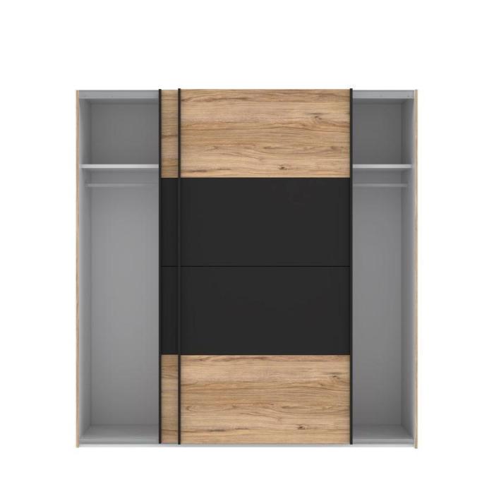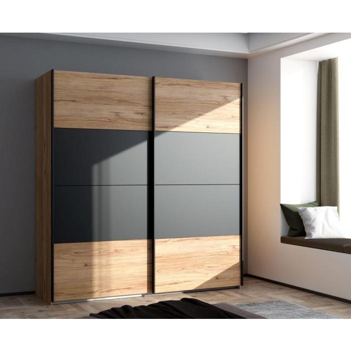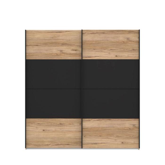 Szafa dwudrzwiowa Dalate to doskonała propozycja do sypialni czy też do przedpokoju w stylu loftowym. Korpus oraz fronty szafy wykonane są w dekorze Dąb Catania/Czarny. Całość w matowym wykończeniu. Szafa posiada drzwi przesuwne oraz wygodny listwowy uchwyt w kolorze czarnym.