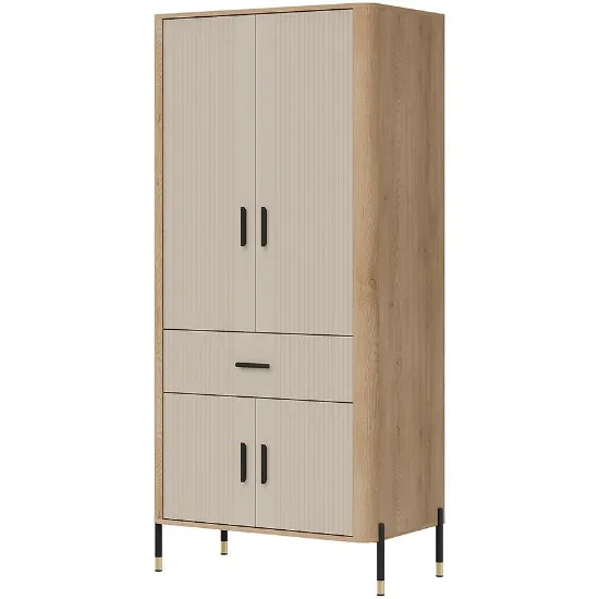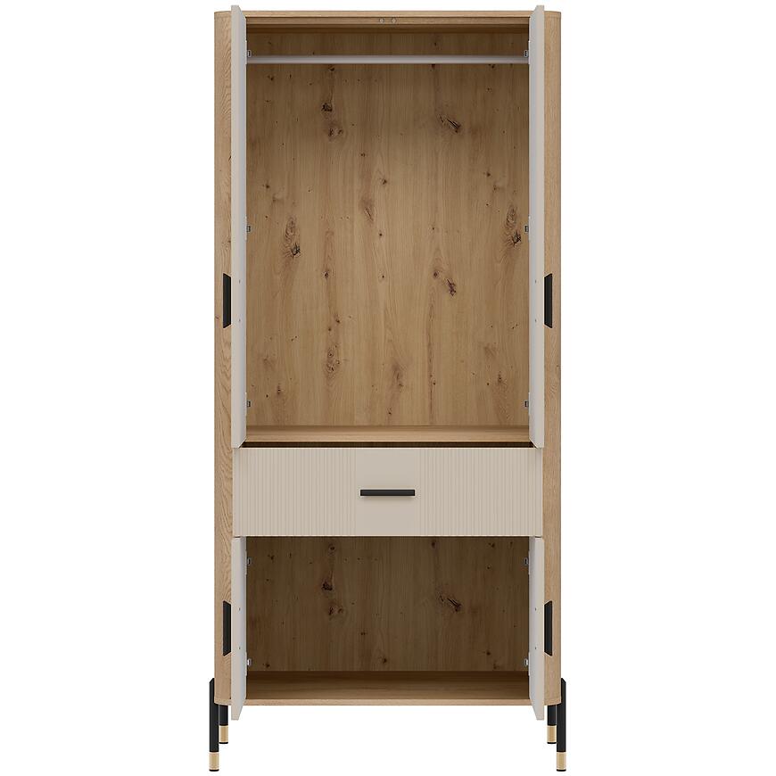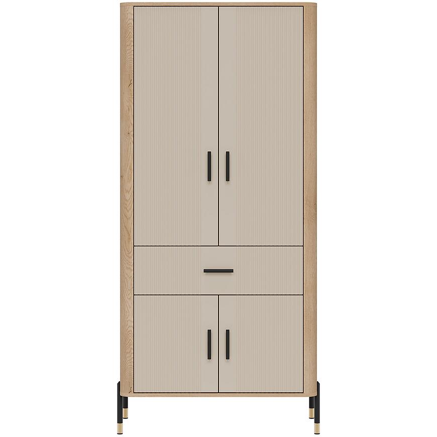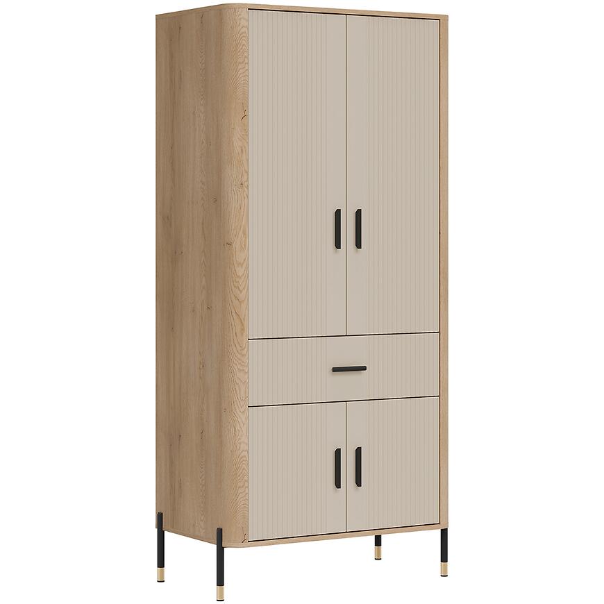 Beżowe fronty w matowym wykończeniu nadają szafie nowoczesny, stonowany charakter, który harmonizuje z korpusem w kolorze dąb cremona. Takie zestawienie kolorów pozwala na łatwe łączenie mebla z innymi elementami kolekcji DANTE oraz dodatkami w neutralnych i naturalnych tonacjach.