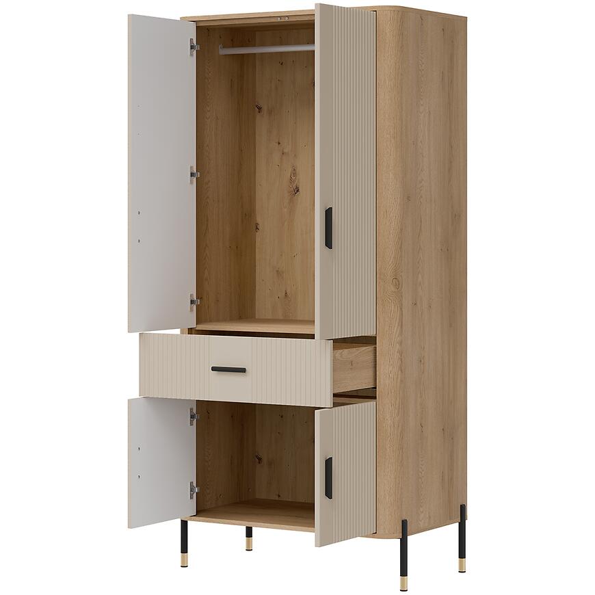 Szafa Dante DT16 w kolorze dąb cremona z frontami w odcieniu kaszmiru to elegancki i funkcjonalny mebel do nowoczesnych wnętrz. Beżowe fronty wprowadzają do pomieszczenia subtelną miękkość i ciepło, a naturalny odcień korpusu równoważy całość, nadając szafie spokojny i nowoczesny charakter. Matowe wykończenie frontów i korpusu podkreśla prostą linię mebla i ułatwia utrzymanie go w czystości.