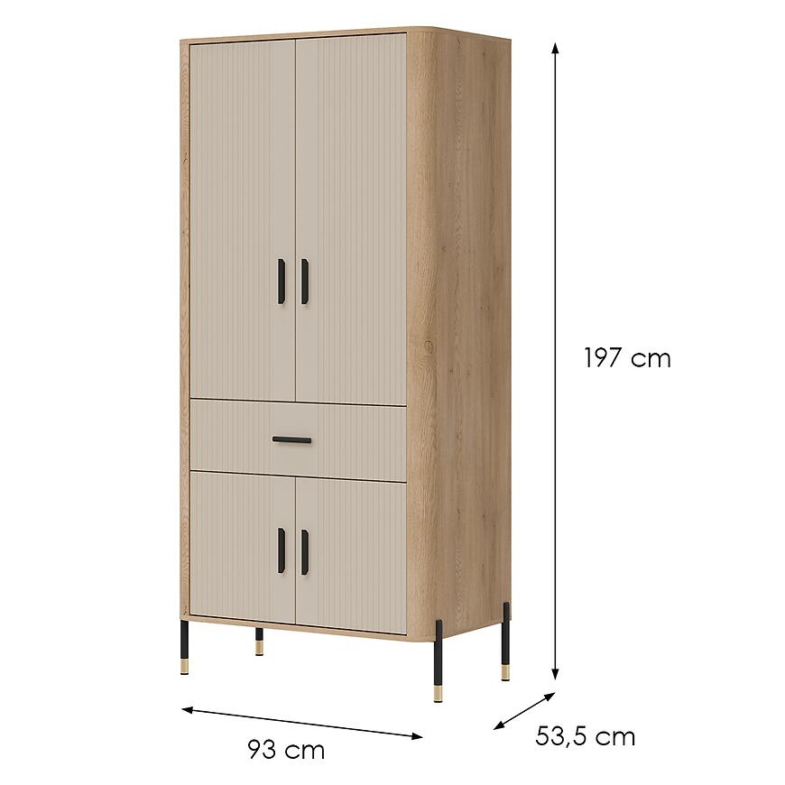 Szerokość 93 cm, wysokość 197 cm i głębokość 53,5 cm zapewniają dużą powierzchnię do przechowywania ubrań, dodatków i innych elementów garderoby. Klasyczne kilkudrzwiowe drzwi umożliwiają łatwy dostęp do wnętrza szafy, a prosty kształt pozwala optymalnie zagospodarować przestrzeń w sypialni lub przedpokoju.