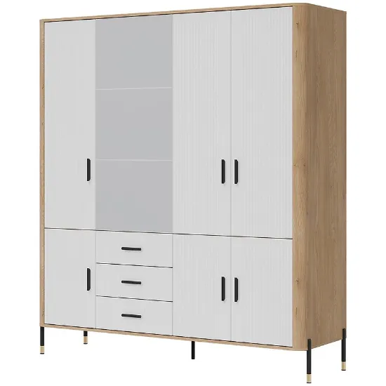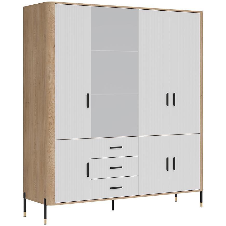 Fronty wykonano z płyty MDF, co gwarantuje trwałość i elegancki wygląd, natomiast korpus z laminowanej płyty wiórowej zapewnia stabilną konstrukcję odporną na codzienne użytkowanie. Kilkudrzwiowa forma z lustrem pozwala wygodnie przechowywać zarówno wieszaki, jak i składane elementy garderoby, a wbudowane lustro pełni jednocześnie funkcję praktyczną i dekoracyjną.