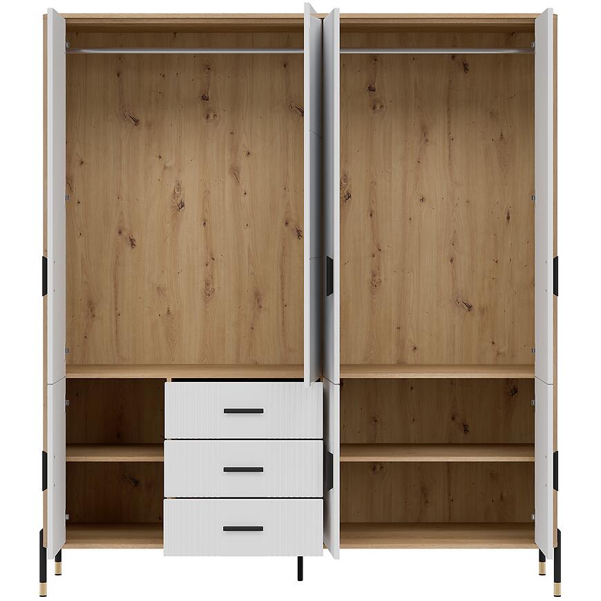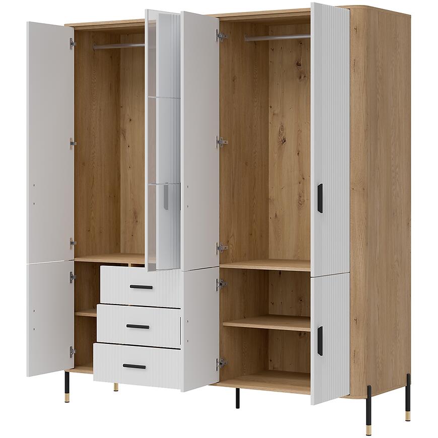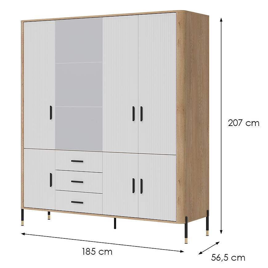 Szerokość 185 cm, wysokość 207 cm i głębokość 56,5 cm zapewniają dużą przestrzeń do przechowywania ubrań, dodatków i innych elementów garderoby. Klasyczne kilkudrzwiowe drzwi umożliwiają wygodny dostęp do wnętrza szafy, a prosty kształt pozwala optymalnie zagospodarować przestrzeń w sypialni lub przedpokoju.