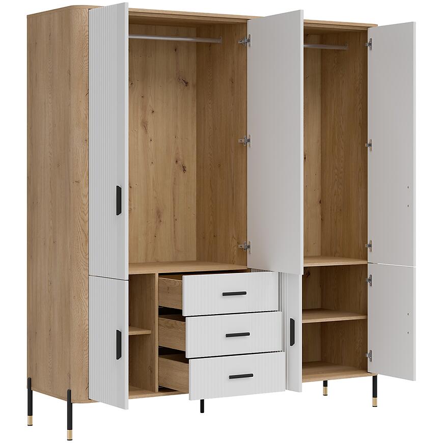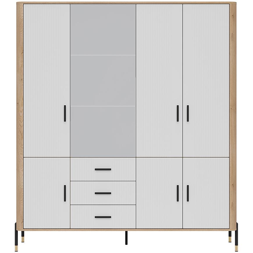 Białe fronty w matowym wykończeniu nadają szafie nowoczesny, lekki charakter, który harmonizuje z korpusem w kolorze dąb cremona. Takie zestawienie kolorów pozwala na łatwe dopasowanie szafy do innych mebli z kolekcji DANTE oraz dodatków w neutralnych i pastelowych tonacjach.