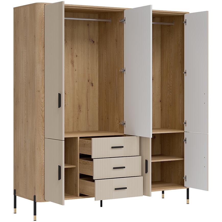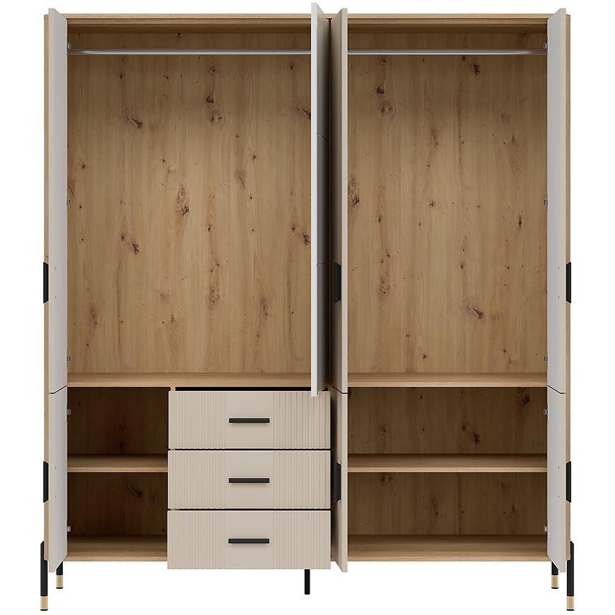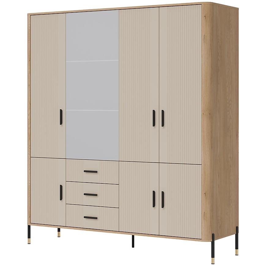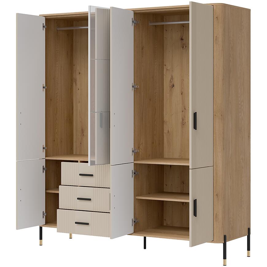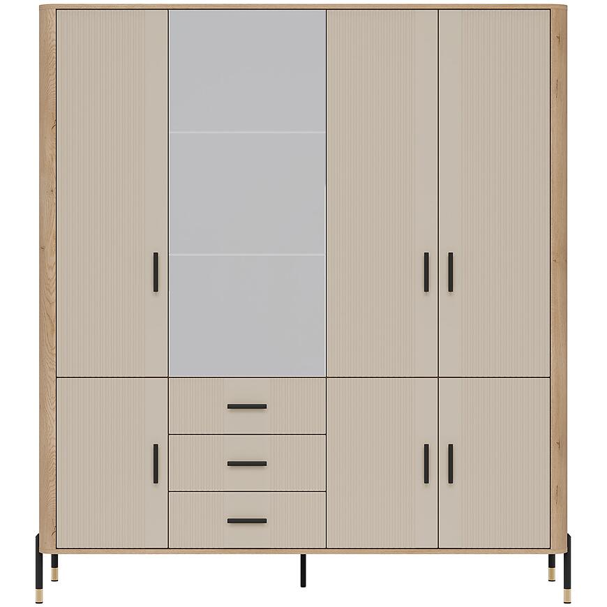 Beżowe fronty w matowym wykończeniu nadają szafie nowoczesny, subtelny charakter, który harmonizuje z korpusem w kolorze dąb cremona. Takie zestawienie kolorów umożliwia łatwe dopasowanie szafy do innych mebli z kolekcji DANTE oraz dodatków w neutralnych i naturalnych tonacjach.