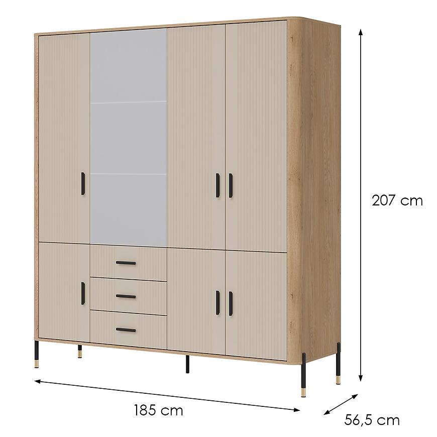 Szerokość 185 cm, wysokość 207 cm i głębokość 56,5 cm zapewniają dużą przestrzeń do przechowywania ubrań, dodatków i innych elementów garderoby. Klasyczne kilkudrzwiowe drzwi umożliwiają wygodny dostęp do wnętrza szafy, a prosty kształt pozwala optymalnie zagospodarować przestrzeń w sypialni lub przedpokoju.