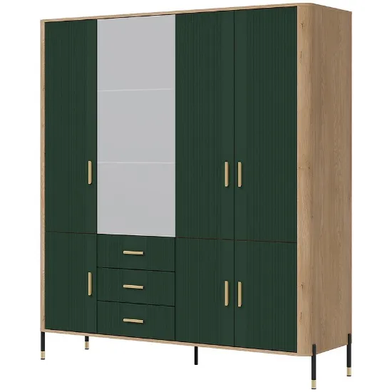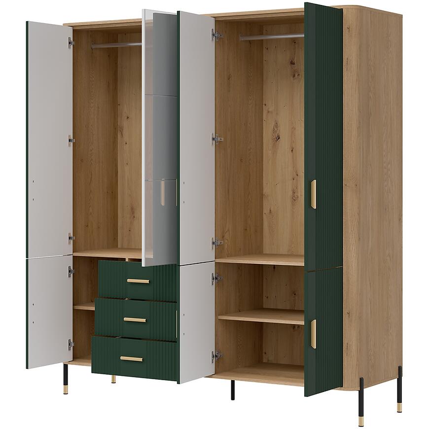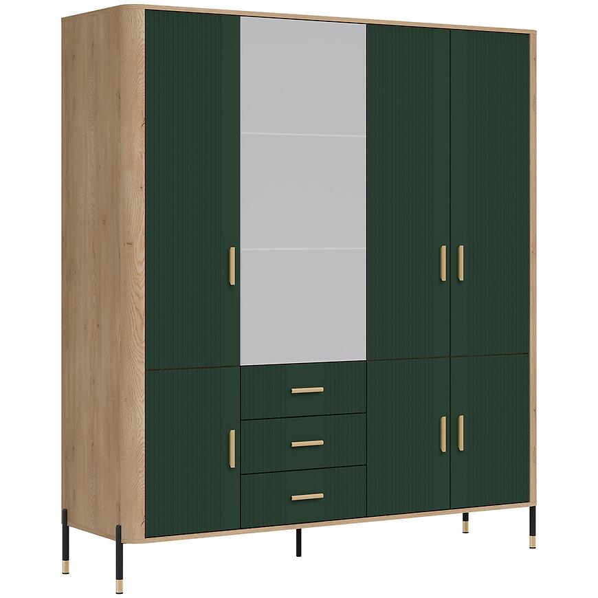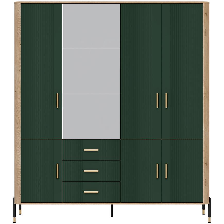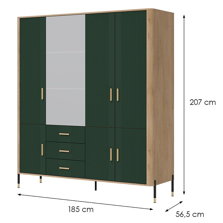 Szafa Dante DT17 dąb cremona zielony z lustrem to nowoczesny i funkcjonalny mebel, który łączy elegancki design z praktycznym układem przechowywania. Sprawdzi się w sypialni lub przedpokoju, tworząc stylową, uporządkowaną i przestronną przestrzeń z dodatkową funkcją lustra.