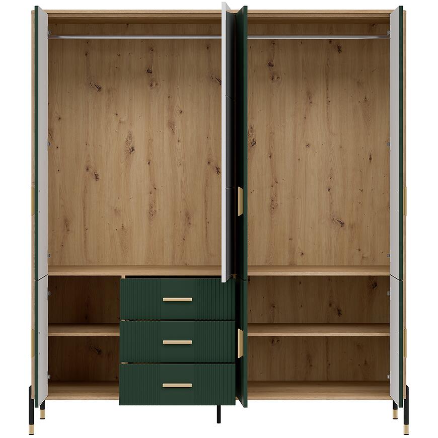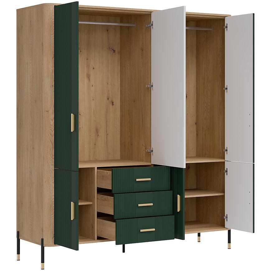 Zielone fronty w matowym wykończeniu nadają szafie nowoczesny, wyrazisty charakter, który harmonizuje z korpusem w kolorze dąb cremona. Takie zestawienie kolorów pozwala na łatwe dopasowanie szafy do innych mebli z kolekcji DANTE oraz dodatków w neutralnych i naturalnych tonacjach.