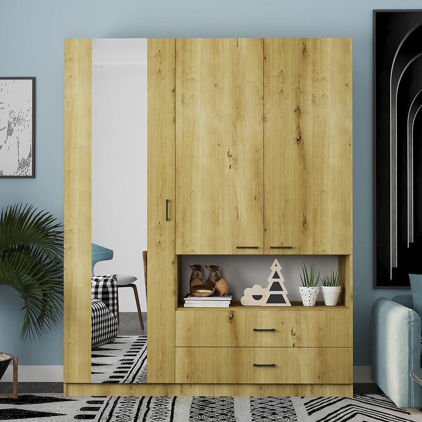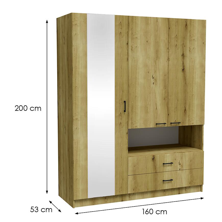 Szafa Delta artisan to przestronny i funkcjonalny mebel o wymiarach 160 cm szerokości, 200 cm wysokości i 53 cm głębokości. Wyposażona jest w troje klasycznych drzwi, z czego środkowe zawiera lustro, które zwiększa komfort użytkowania i optycznie powiększa pomieszczenie. Zarówno fronty, jak i korpus wykonane zostały z płyty wiórowej laminowanej w dekorze dąb artisan, a matowe wykończenie nadaje szafie eleganckiego, nowoczesnego charakteru. Konstrukcja prosta i solidna doskonale wpisuje się w aktualne trendy aranżacyjne, łącząc estetykę z praktycznością. Szafa nie posiada oświetlenia, waży 125 kg i wymaga samodzielnego montażu. Należy do kolekcji DELTA i stanowi idealne rozwiązanie do sypialni, garderoby czy nowoczesnego przedpokoju.