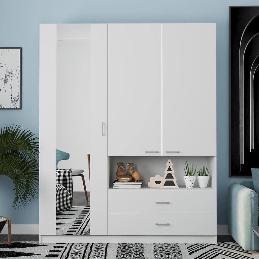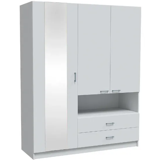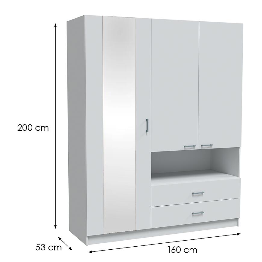 Szafa Delta biała to nowoczesny i przestronny mebel o wymiarach 160 cm szerokości, 200 cm wysokości i 53 cm głębokości. Posiada trzy klasyczne drzwi, w tym jedno z lustrem, które optycznie powiększa wnętrze i ułatwia codzienne użytkowanie. Zarówno fronty, jak i korpus wykonane zostały z płyty wiórowej laminowanej w białym, matowym wykończeniu, co nadaje szafie elegancki, minimalistyczny wygląd. Prosta konstrukcja łączy funkcjonalność z estetyką, a brak wbudowanego oświetlenia pozwala na swobodne dopasowanie do różnych aranżacji wnętrz. Szafa należy do kolekcji DELTA, waży 125 kg i wymaga samodzielnego montażu, stanowiąc praktyczne rozwiązanie do sypialni, garderoby lub nowoczesnego przedpokoju.