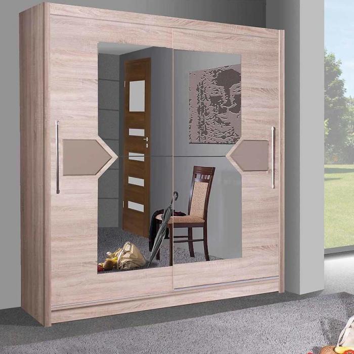 Szafa przesuwna to propozycja do pokoju dziennego, ale znajdzie swoje miejsce również w innym pomieszczeniu, jak na przykład - przedpokój czy garderobie. Materiał wykonania to płyta wiórowa laminowana/płyta MDF. Szafa posiada półki oraz drążek na ubrania. Szafa posiada również lustro, które sprawi, że pomieszczenie stanie się optycznie większe. Nowoczesny styl mebli wpadnie do gustu każdemu, kto poszukuje eleganckiego, klasycznego, a zarazem nowoczesnego umeblowania. Idealnie wpasuje się w większość aranżacji. Przeznaczona do samodzielnego montażu.