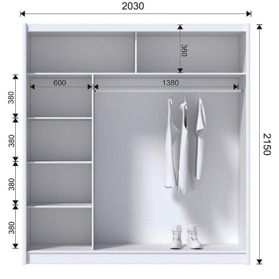 Przesuwne drzwi są jednym z kluczowych atutów tego modelu, ponieważ pozwalają zaoszczędzić przestrzeń w pokoju, co jest szczególnie ważne w mniejszych pomieszczeniach. Bez konieczności otwierania drzwi na zewnątrz, szafa nie blokuje przestrzeni przed sobą, co czyni ją idealnym rozwiązaniem do sypialni, garderoby czy przedpokoju. Dwudrzwiowy system przesuwny działa płynnie i cicho, co zapewnia komfortowe korzystanie z mebla na co dzień.