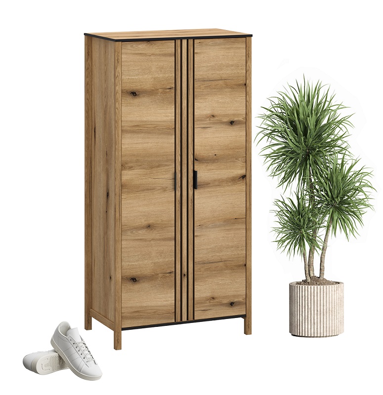 Czarne wykończenia blatu oraz metalowe uchwyty w kolorze czarnym nadają szafie eleganckiego kontrastu, podkreślając jej designerski wygląd. Dwudrzwiowa konstrukcja z uchylanymi drzwiami sprawia, że korzystanie z szafy jest łatwe i komfortowe. Wnętrze szafy kryje cztery półki, umożliwiające porządkowanie ubrań, akcesoriów czy innych przedmiotów.