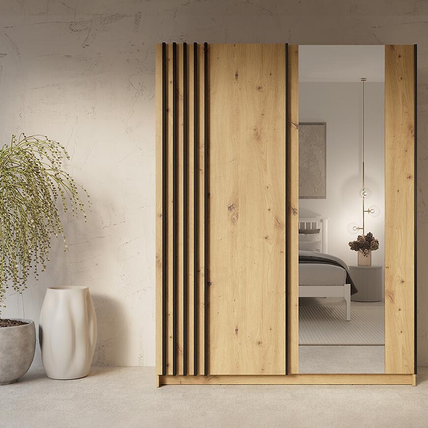 Front szafy Bayadero 10 III został wzbogacony o dekoracyjne lamele w kolorze czarnym. Ten detal przełamuje jednolitą powierzchnię dębu artisan i wprowadza wyraźny akcent geometryczny. Dzięki temu mebel dobrze wpisuje się w aranżacje nowoczesne, loftowe oraz minimalistyczne.