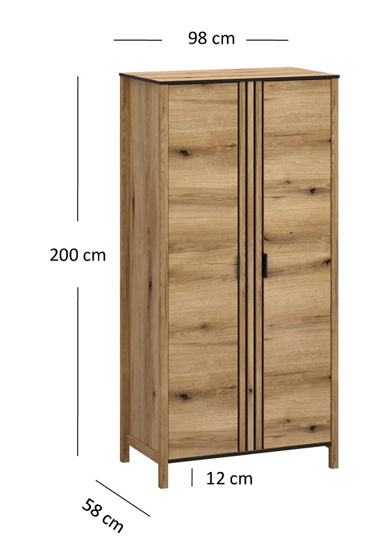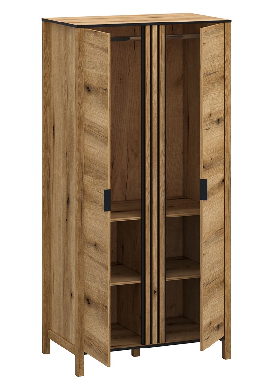 Czarne wykończenia blatu oraz metalowe uchwyty w kolorze czarnym nadają szafie eleganckiego kontrastu, podkreślając jej designerski wygląd. Dwudrzwiowa konstrukcja z uchylanymi drzwiami sprawia, że korzystanie z szafy jest łatwe i komfortowe. Wnętrze szafy kryje cztery półki, umożliwiające porządkowanie ubrań, akcesoriów czy innych przedmiotów.