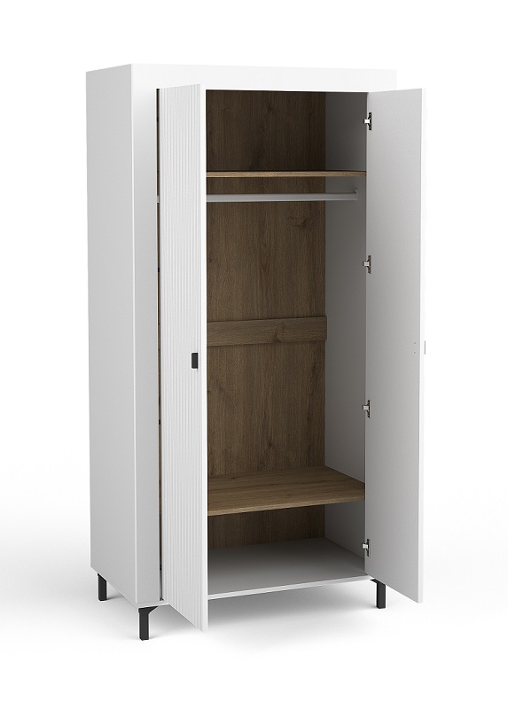 Szafa Mossa MO1 wyróżnia się frontami w kolorze biały mat z efektem prążkowania, które dodają jej oryginalnego charakteru oraz subtelnego uroku. Prążkowana powierzchnia frontów przyciąga wzrok i dodaje szafie wyrafinowanego stylu, jednocześnie zachowując minimalistyczną estetykę.