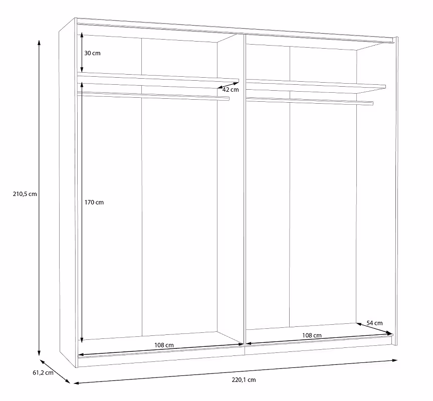 Ossett 220 wyróżnia się imponującymi wymiarami – jej szerokość wynosi 220,10 cm, a głębokość 61,20 cm, co zapewnia ogromną przestrzeń do przechowywania ubrań, butów i akcesoriów. Drzwi przesuwne poruszają się cicho i płynnie, co zwiększa komfort użytkowania oraz dodaje wnętrzu nowoczesnego charakteru.
