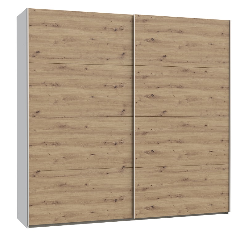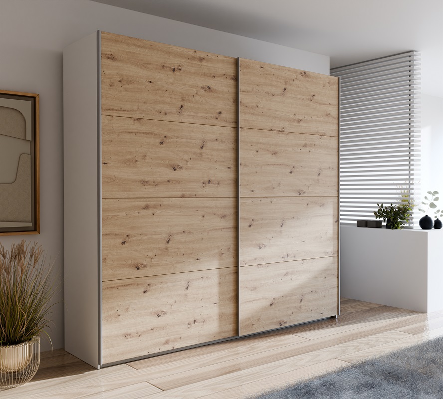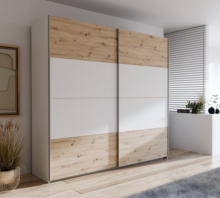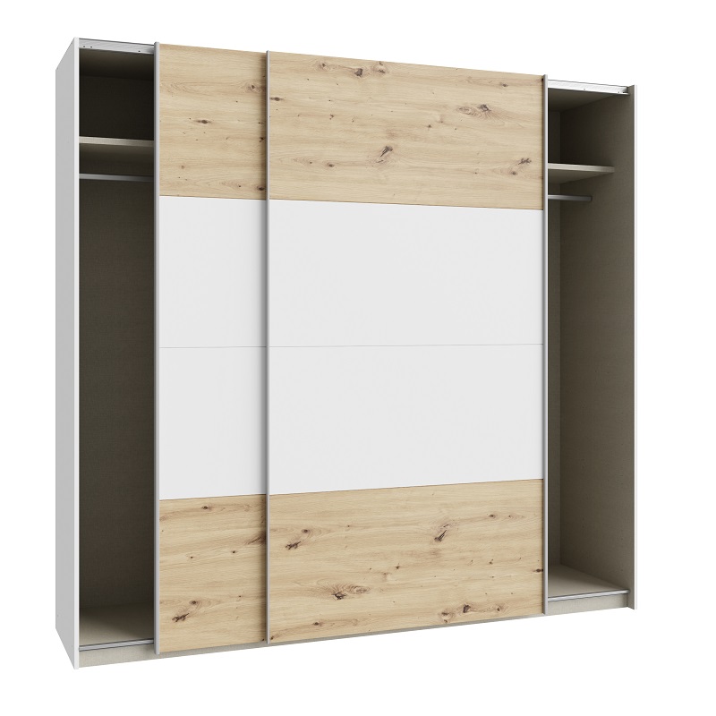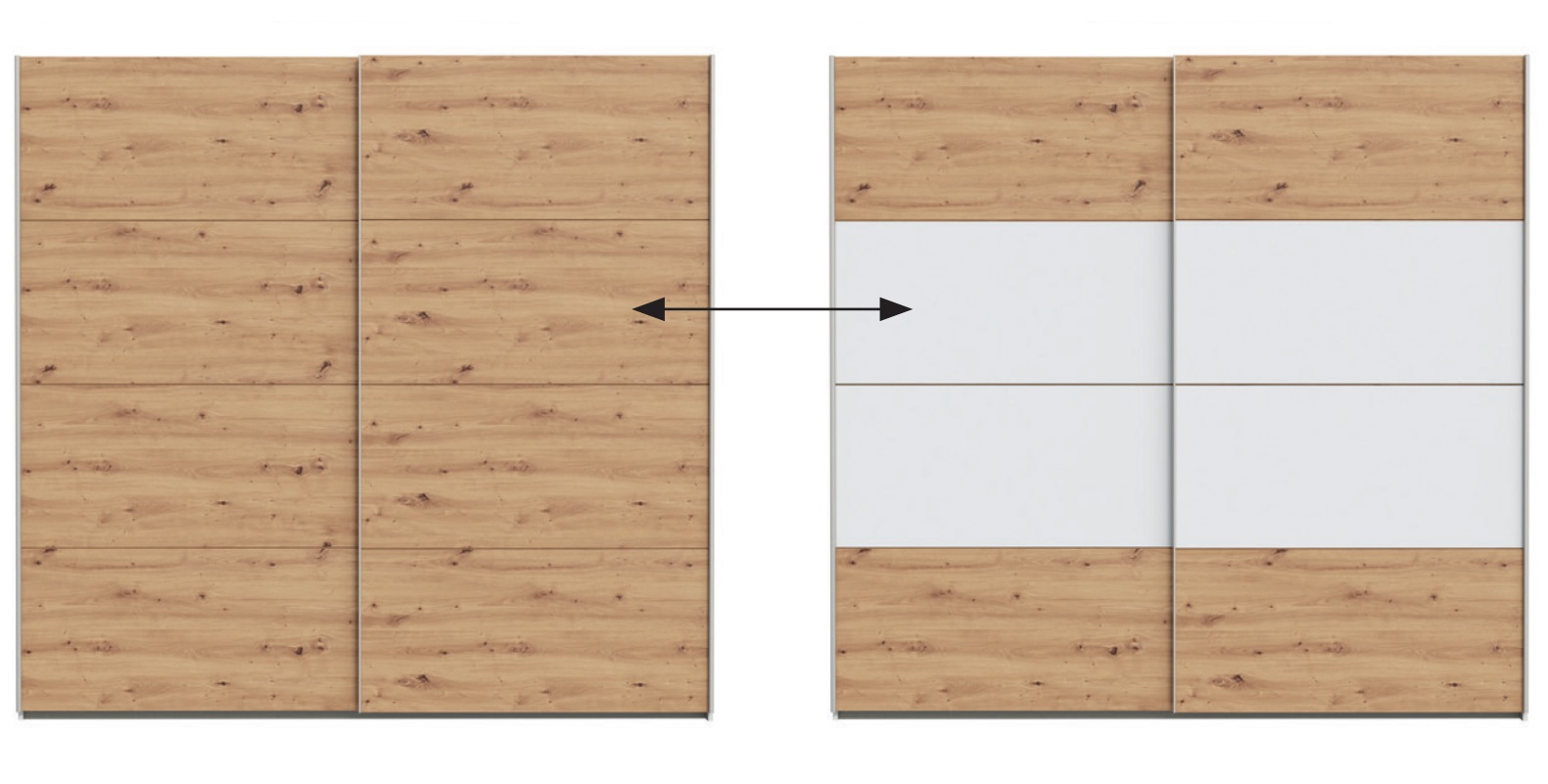 Jednym z najbardziej unikalnych elementów szafy Ossett 220 są fronty, składające się z czterech dwustronnych paneli. Panele te dostępne są w dwóch kolorach: dąb artisan i biały, co umożliwia dowolne ich aranżowanie. Dzięki temu można personalizować wygląd szafy, dostosowując go do indywidualnych preferencji oraz stylu wnętrza.