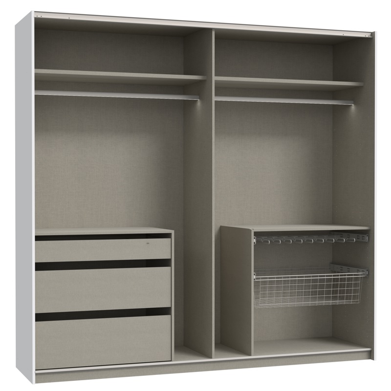 Wnętrze szafy wykonane jest w eleganckim kolorze szarym, imitującym materiał. To praktyczne i estetyczne rozwiązanie, które nadaje szafie nowoczesnego charakteru i sprawia, że przechowywane w niej przedmioty są dobrze widoczne. W podstawowym wyposażeniu szafa Ossett 220 posiada dwie stałe półki oraz drążki na ubrania, co zapewnia wygodne i uporządkowane przechowywanie odzieży.